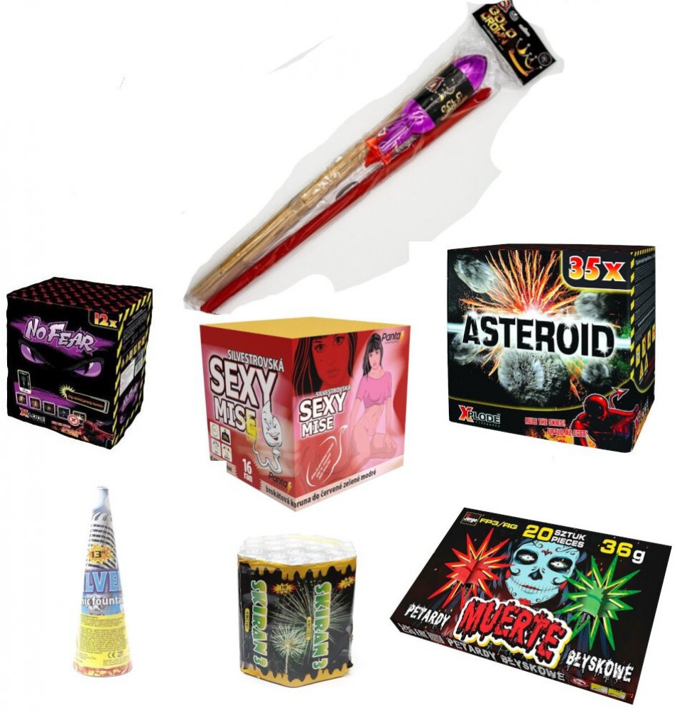 Použití a bezpečnostní doporučení:Tento balíček obsahuje výrobky kategorie F3 a je určen výhradně pro osoby starší 21 let. Používejte pouze na volném prostranství, za dodržení všech bezpečnostních pokynů uvedených na obalu. U petard a ohňostrojů dodržujte doporučený odstup a používejte ochranné brýle a rukavice.