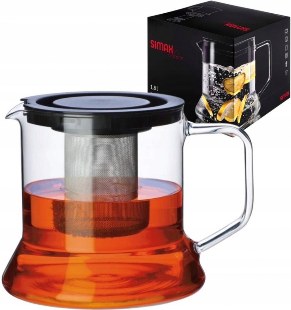 Větší konvice o objemu 1,7l s kovovým sítkem Ideální konvice pro všechny čaje, skleněné provedení dává čajům možnost vyniknout nejen svou chutí, ale i vzhledem. Kovový filtr, vhodný k louhování bylinek, lze snadno vyjmout a konvici lze použít i bez něj. Je vhodná k použití na elektrickém i plynovém sporáku s rozptylovačem plamene. Konvice je vyrobena z kvalitní skloviny SIMAX, která odolává vysokým teplotám až do 300 °C, ale i nízkým do -40°C. Snadno se udržuje - lze mýt v myčce. Schváleno pro styk s potravinami v domácnostech i profesionálních provozech. Výrobky z hlediska zdravotní nezávadnosti a bezpečnosti při používání podléhají dozoru státních kontrolních orgánů České republiky. Vyrobeno z recyklovatelné skloviny bez kadmia a olova.Dodržujte zásadu pozvolného ochlazování. Myjte jemnými mycími prostředky, které sklo nepoškrábou. Lze používat v mikrovlnné troubě (bez sítka). Lze mýt v automatické myčce. Lze uchovávat v chladničce. Lze používat na elektrické plotýnce. Lze používat na plynové plotýnce s rozptylovačem plamene. Schváleno pro styk s potravinami v domácnostech i profesionálních provozech. Garance použití při teplotě od -40°C do +300°C.