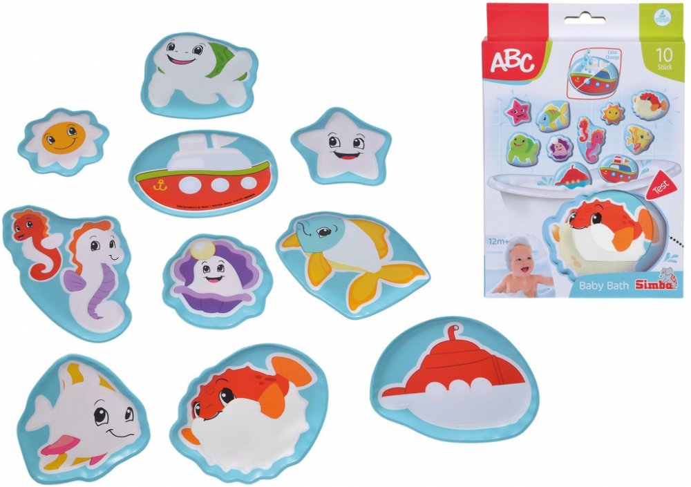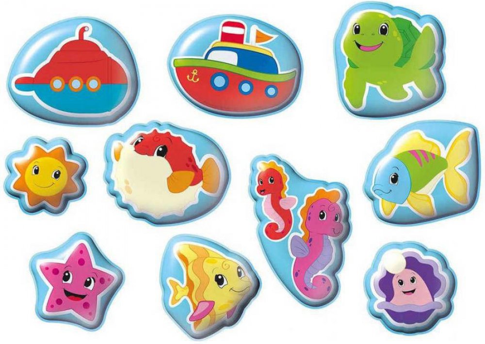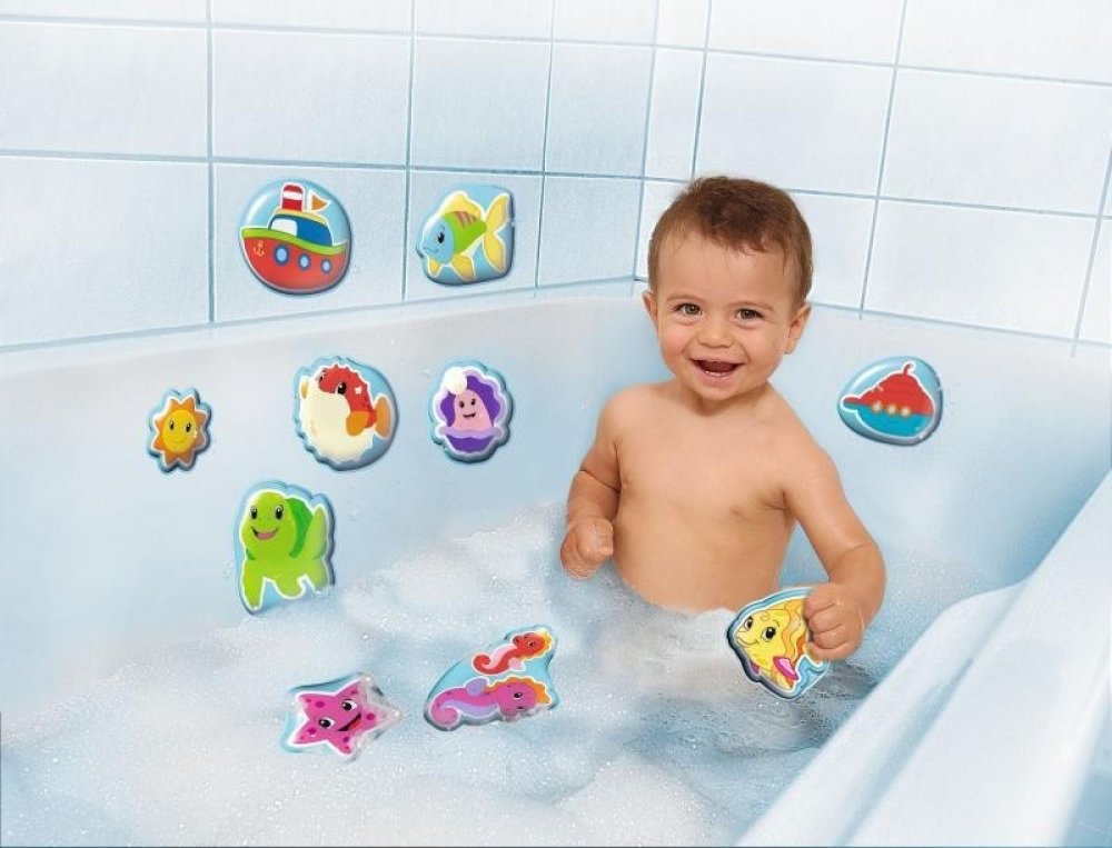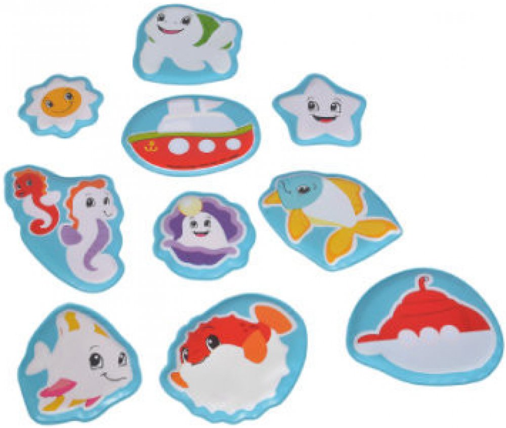 Sada desíti veselých samolepek s mořskými motivy, k nalepení na kachličky nebo stěnu vany, pro nejmenší děti, na koupání do vany.