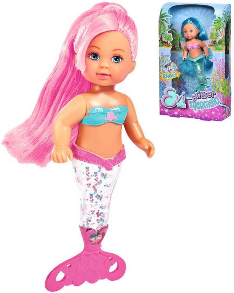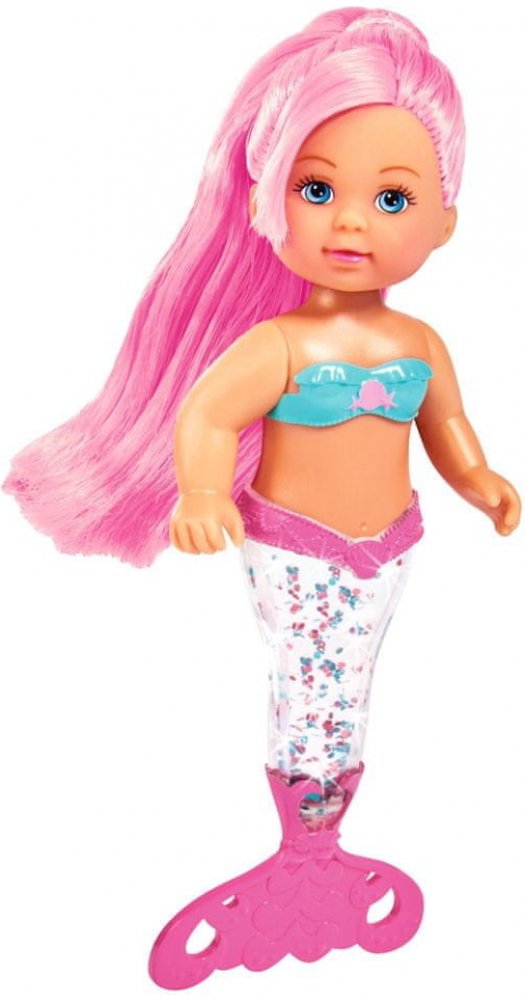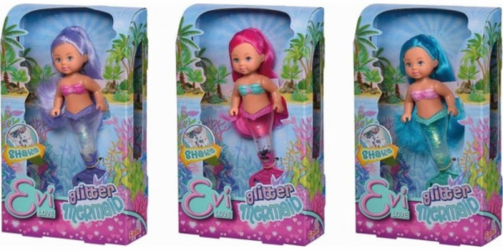 Panenka Evička jako mořská panna s dlouhými barevnými vlásky, s průsvitnou ploutví, která se při pohybu třpytí. Hračka ve třech barevných variantách. Baleno v krabici.