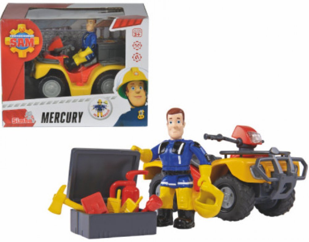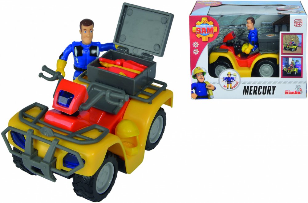 Čtyřkolka Mercury je jedním ze zásahových vozů hasiče Sama a jeho týmu z Pontypandy. V boxu na nosiči má Sam hasičský přístroj, lékárničku, sekyru a mnohé další pro zásah. Podrobnosti: • Obsah: auto, hasič Sam, box s příslušenstvím • Rozměr: ca. 7 x 12,5 x 9 cm • Věk: od 3 let Upozornění! Nevhodné pro děti do tří let. Obsahuje malé části, které by mohly být spolknuty. Nebezpečí udušení!