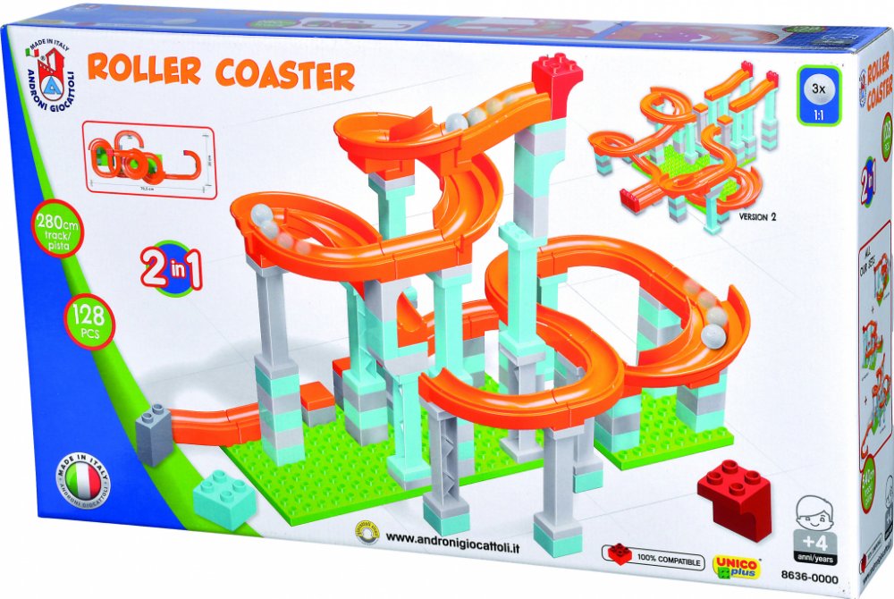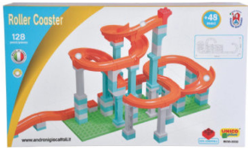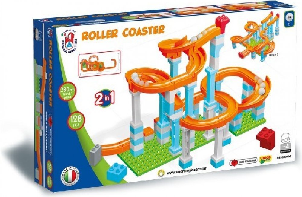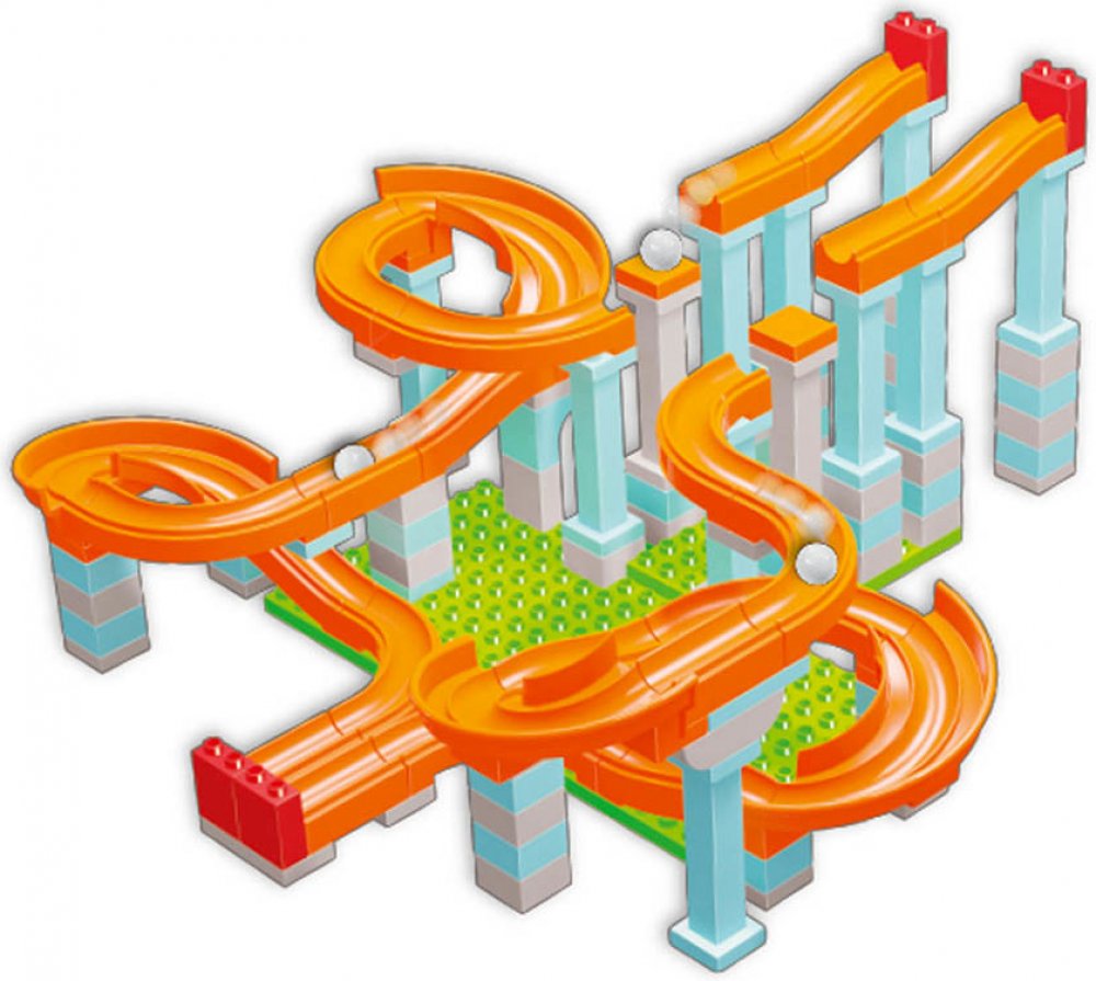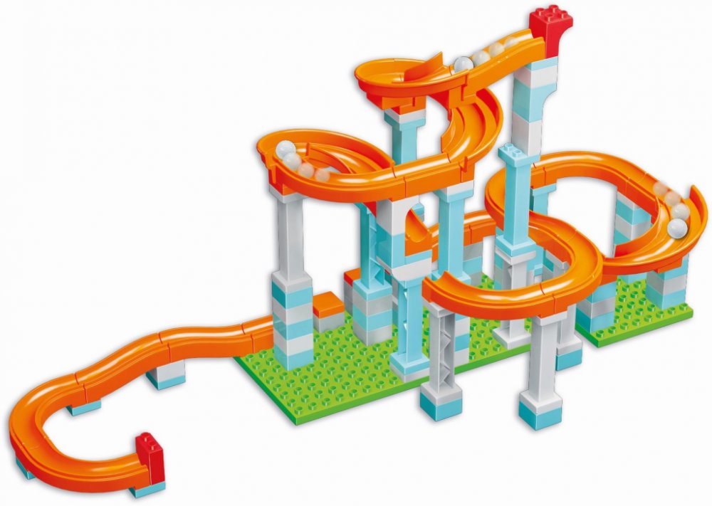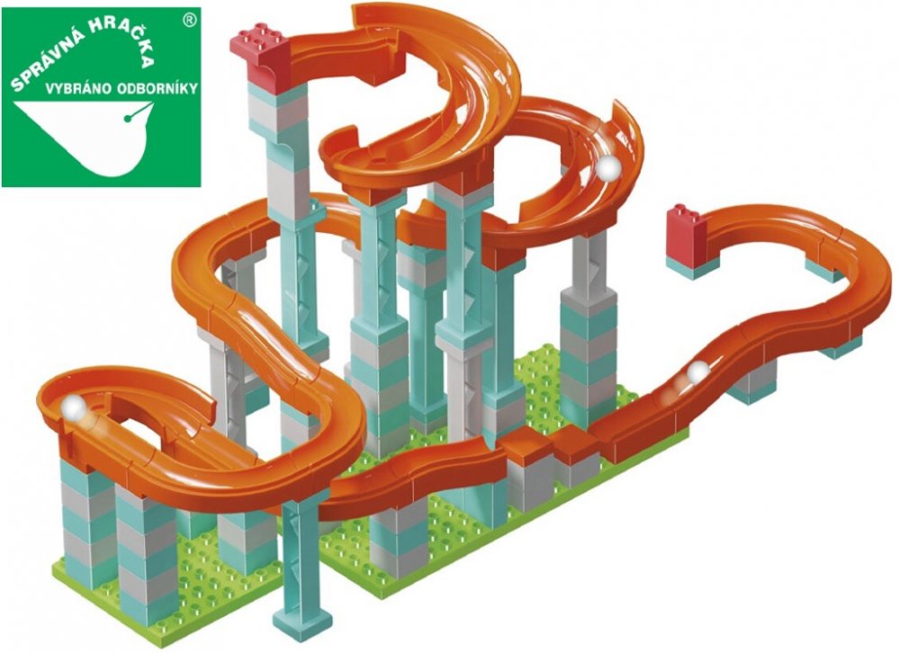 Sada obsahuje 128 dílů včetně 3 plastových kuliček a umožňuje sestavit 2 různé kuličkové dráhy o délce 280 cm.