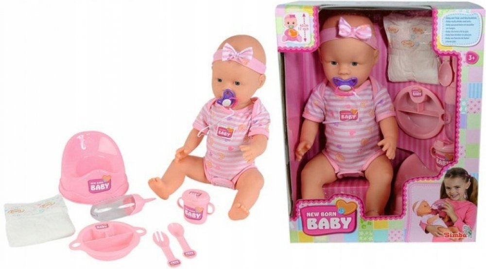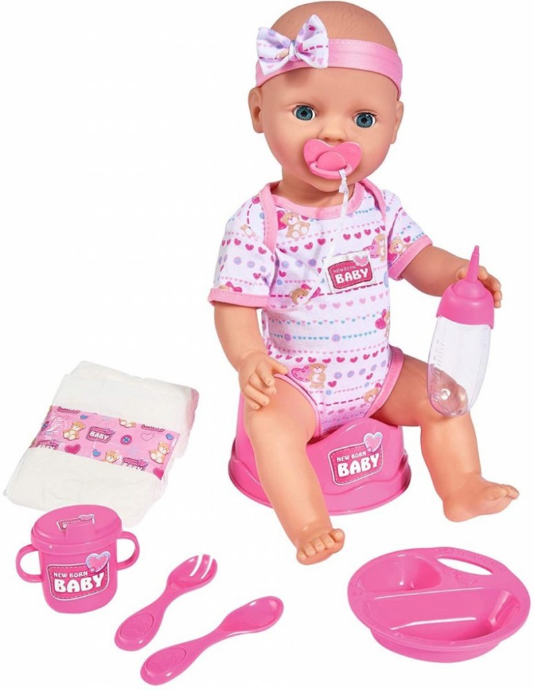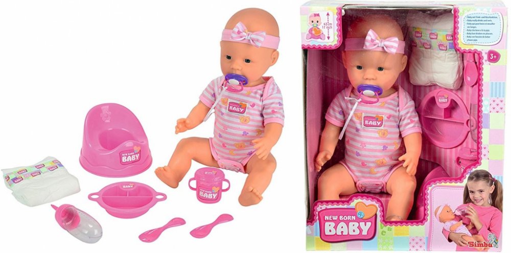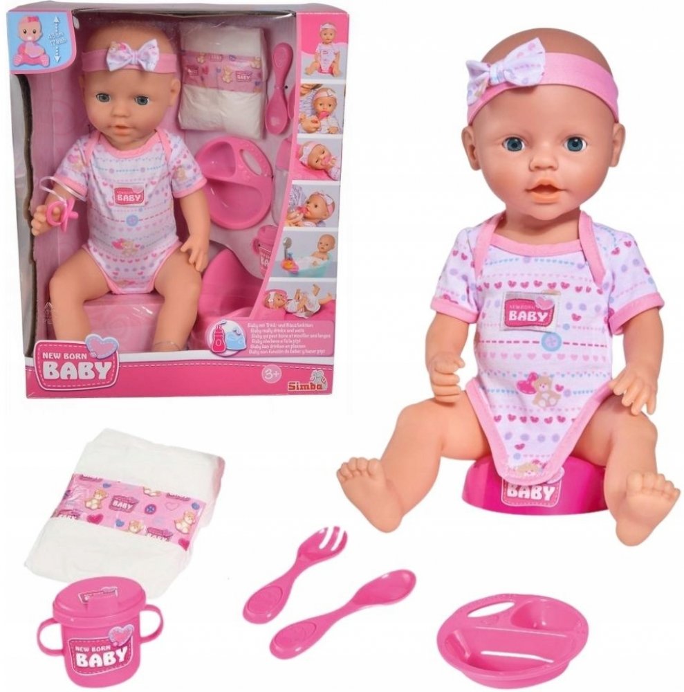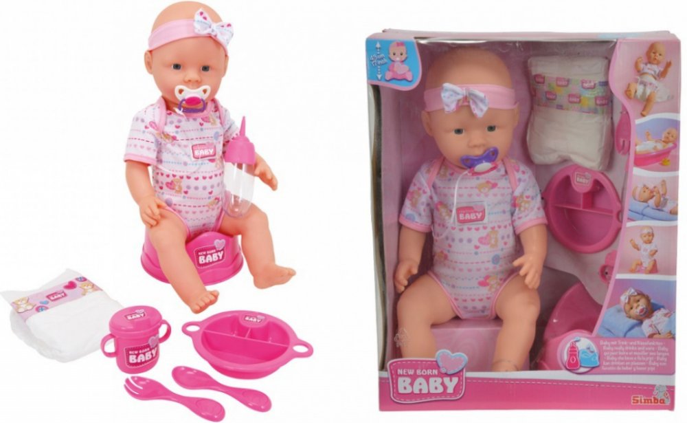 New Born Baby panenka je velká 43 cm, má u sebe spoustu doplnků. Jako správná panenčí maminka se o ni musíš dobře starat. Bryndáček, plenku, jídelní příbor a lahvičku tu také najdeš. Nočník je součástí balení. New Born Baby panenka může bez baterií pít vodu a potom jít na nočník.