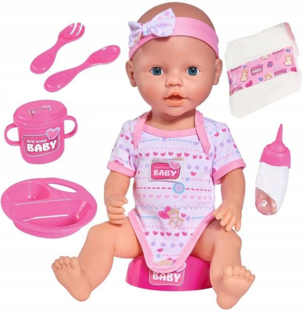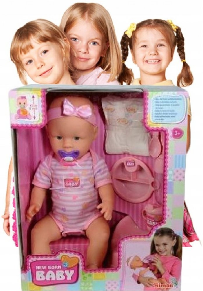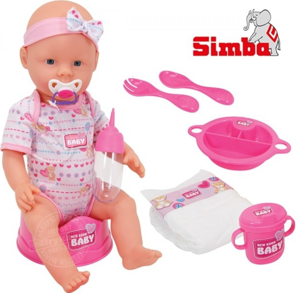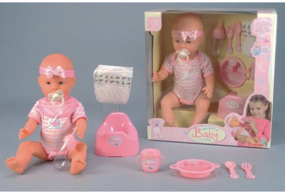 New Born Baby panenka je velká 43 cm, má u sebe spoustu doplnků. Jako správná panenčí maminka se o ni musíš dobře starat. Bryndáček, plenku, jídelní příbor a lahvičku tu také najdeš. Nočník je součástí balení. New Born Baby panenka může bez baterií pít vodu a potom jít na nočník.