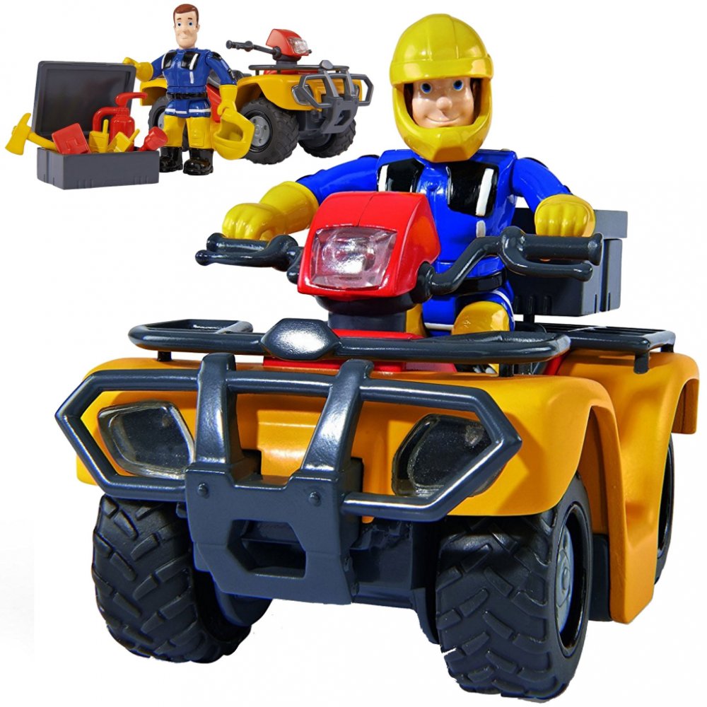 Požárník Sam v sadě se čtyřkolkkou a bedýnkou plnou pracovního nářadí. Baleno v krabici s průhledem.