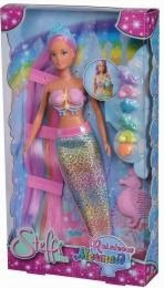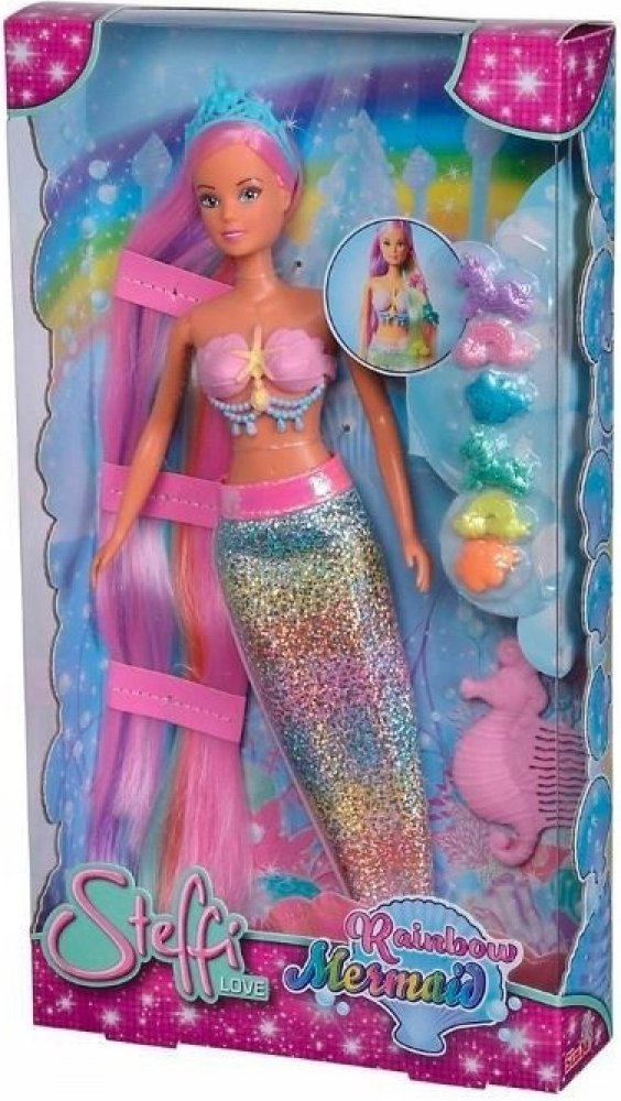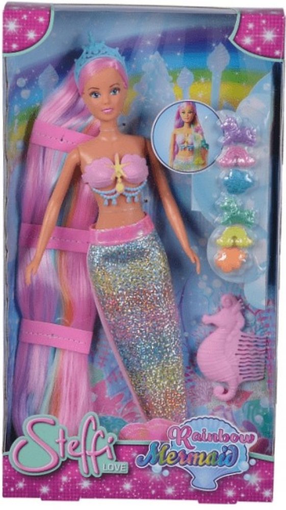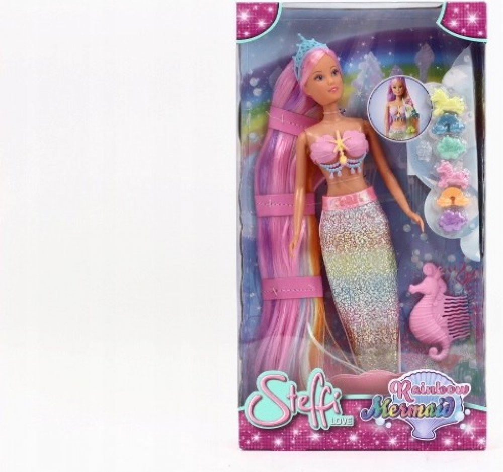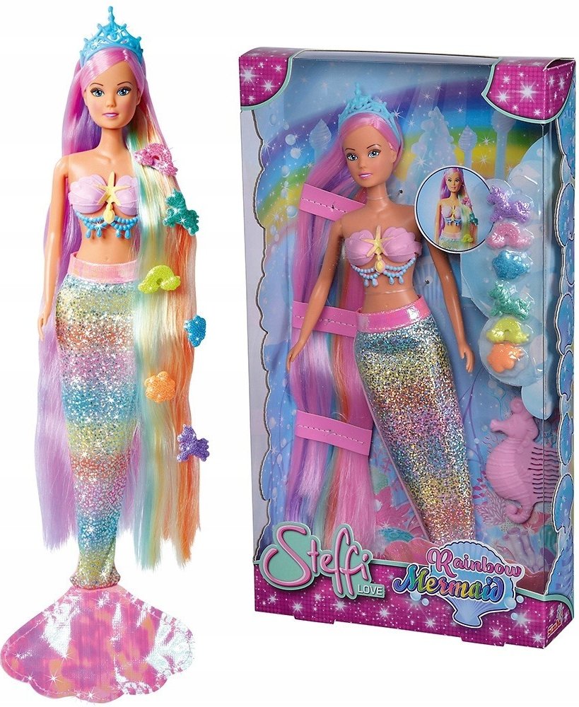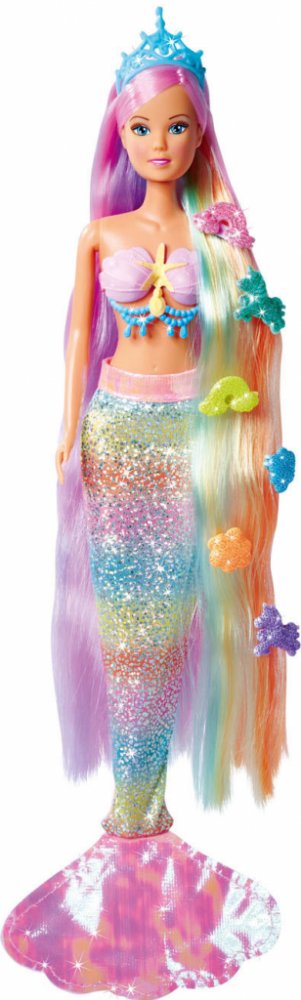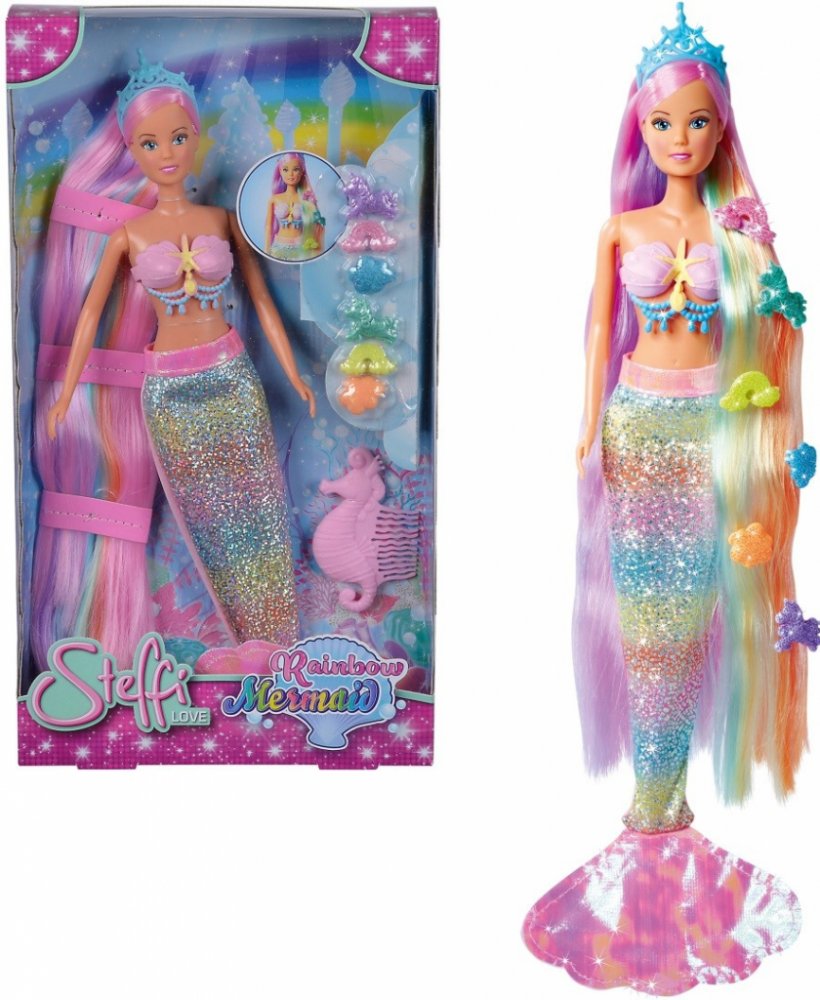 Duhová mořská panna Steffi (29 cm). Panenka má modré oči a dlouhé barevné vlasy. Oblečení panenky tvoří lesklý ocas mořské panny. Díky pohyblivým částem lze panenku umístit do dynamických póz Sada obsahuje: panenku, čelenku, kolíčky, hřeben,