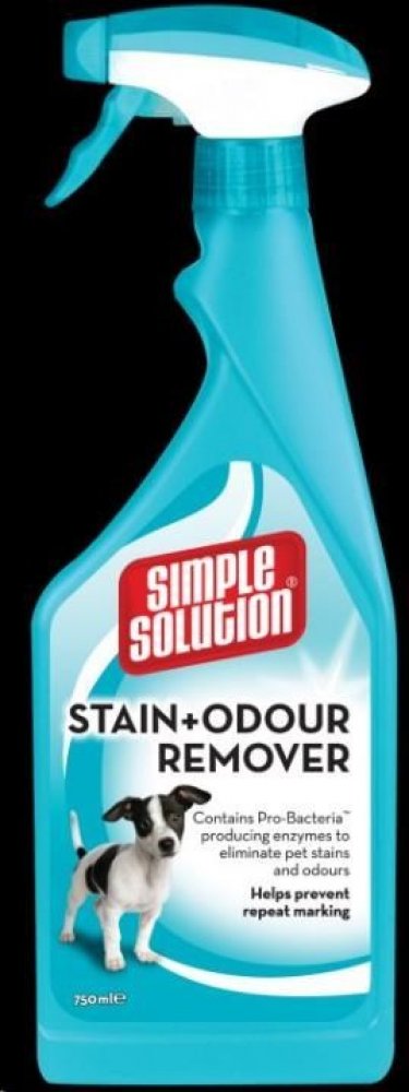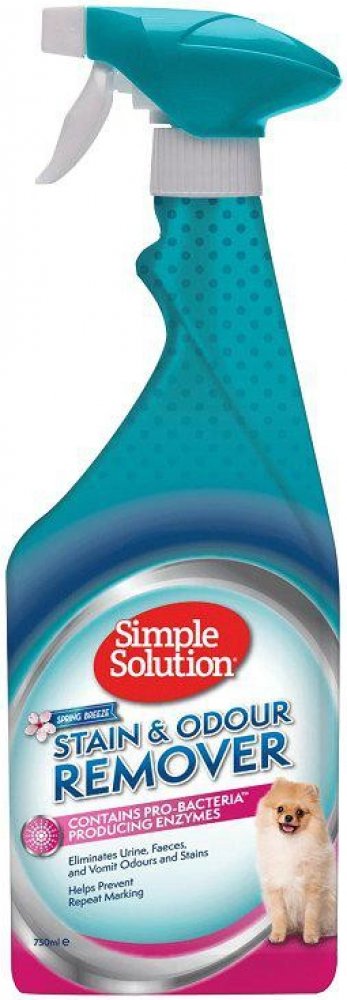 Odolné pachy a skvrny od domácích zvířat vyžadují silný čisticí prostředek. Simple Solution Stain & Odor Remover Spring Breeze má ve svém složení Pro-Bacterie™ a enzymy, které odstraňují skvrny a pachy, čímž zároveň zabraňuje opakovanému označování. Pomůže Vám odstranit moč, výkaly, zvratky a další nečistoty z koberců, čalounění, lůžkovin, látkových hraček, oblečení a dalších voděodolných povrchů.