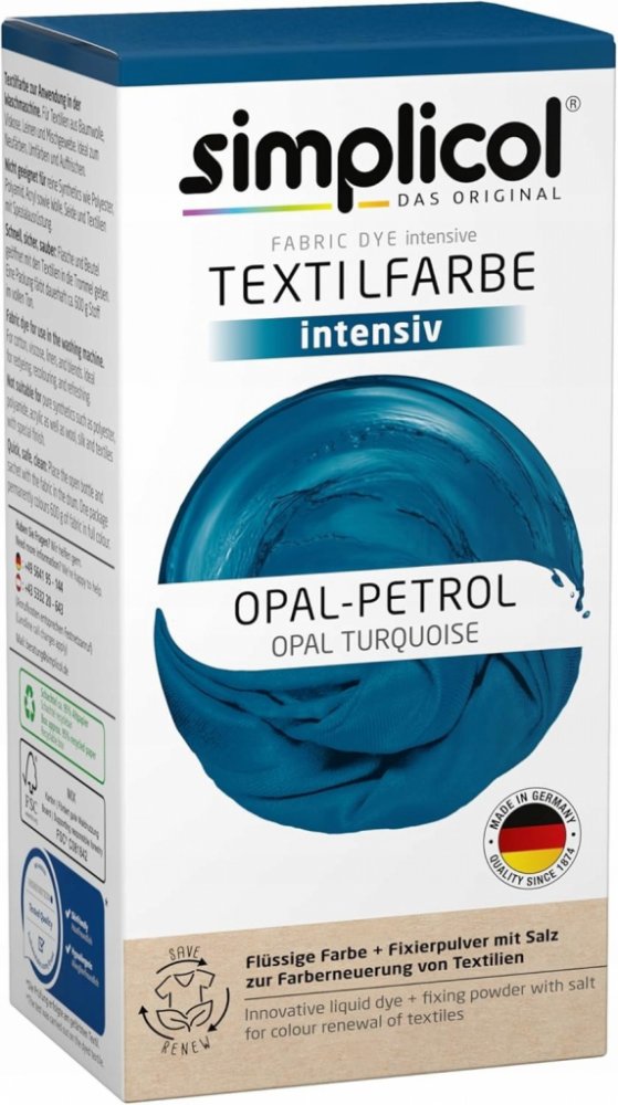 Díky speciálnímu složení je barvivo ideální i pro pračky se systémem úspory vody. Dopřejte svému oblečení nový vzhled a svěžest s Simplicol Opal-Petrol!