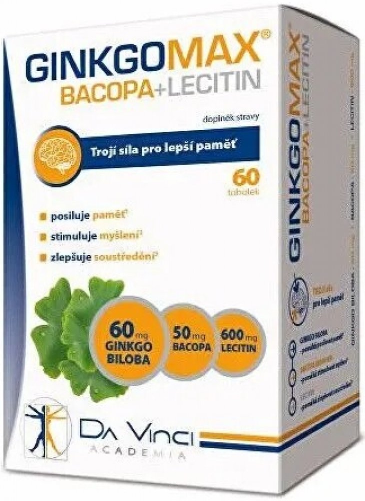 GinkgoMax+Bacopa+Lecitin je doplněk stravy, který je unikátní svým inovovaným a posíleným složením s obsahem standardizovaného extraktu z Ginkgo biloby, vysokým obsahem lecitinu a nově přidanou látkou Bacopa monnieri.