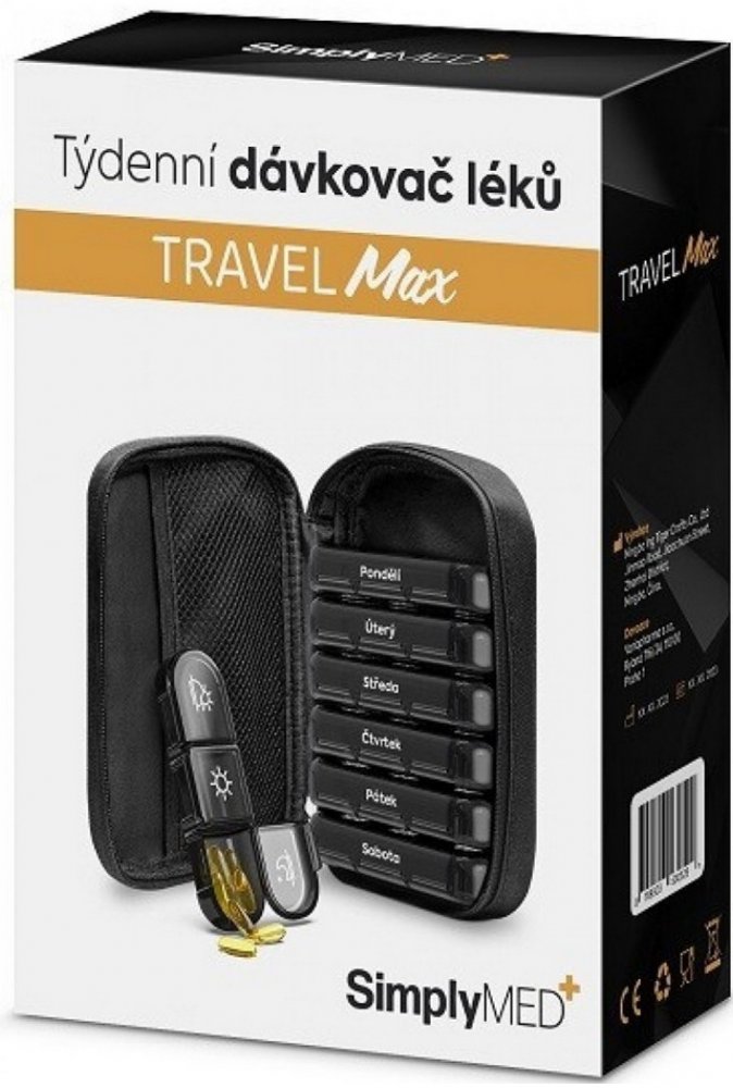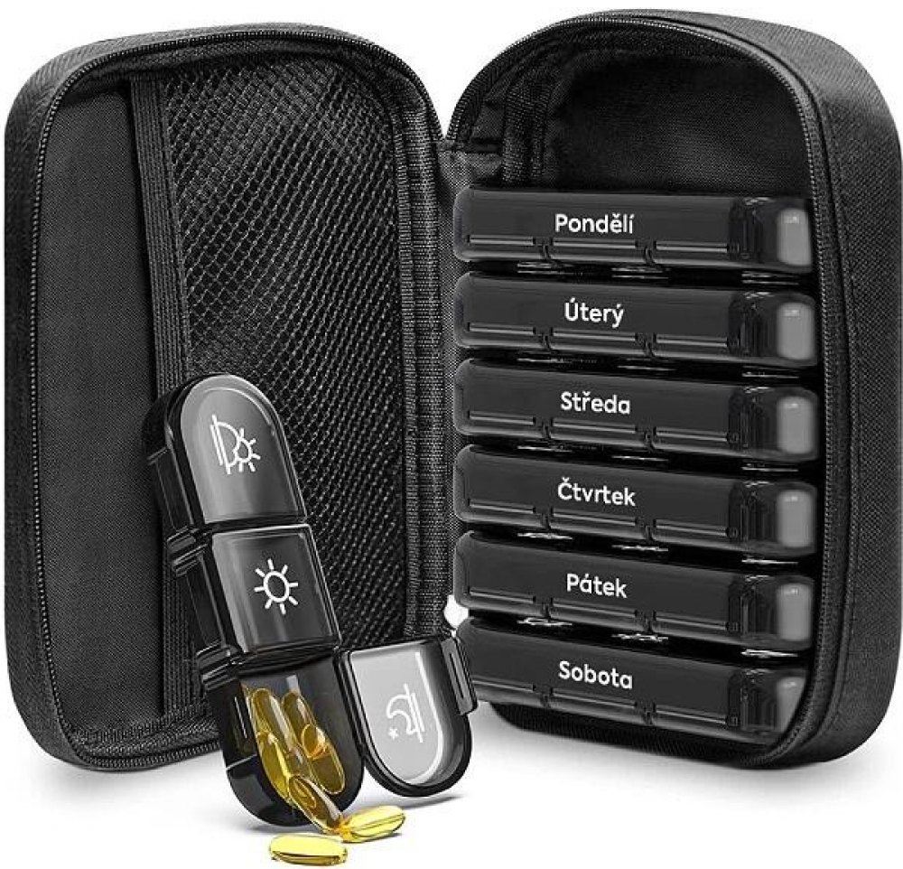 Kompaktní minimalistický dávkovač léků L018 se uplatní zejména na cestách. Nezabírá zbytečně místo, obal se ani při častějším přesouvání nepoškrábe. Tento praktický organizér je totiž uložen v elegantním textilním pouzdře. Za zipem se skrývají kazety na jednotlivé dny v týdnu. Každá kazeta je dělena na dvě přihrádky, které umožňují naplánování dávkování léků dvakrát denně. Jednotlivé, dnem v týdnu i ikonou (ráno/večer) výrazně označené části se otvírají samostatně, nehrozí tak smíchání dávek.Přihrádky na jednotlivé dny jsou použitelné i samostatně. Zakulacený tvar přihrádek zajišťuje dobré využití místa a usnadňuje manipulaci s tabletami či kapslemi. Do vnitřní kapsičky ve víku pouzdra je možno uložit například příbalové letáky k užívaným lékům. Jsou tak stále po ruce.Balení obsahuje 1 ks.