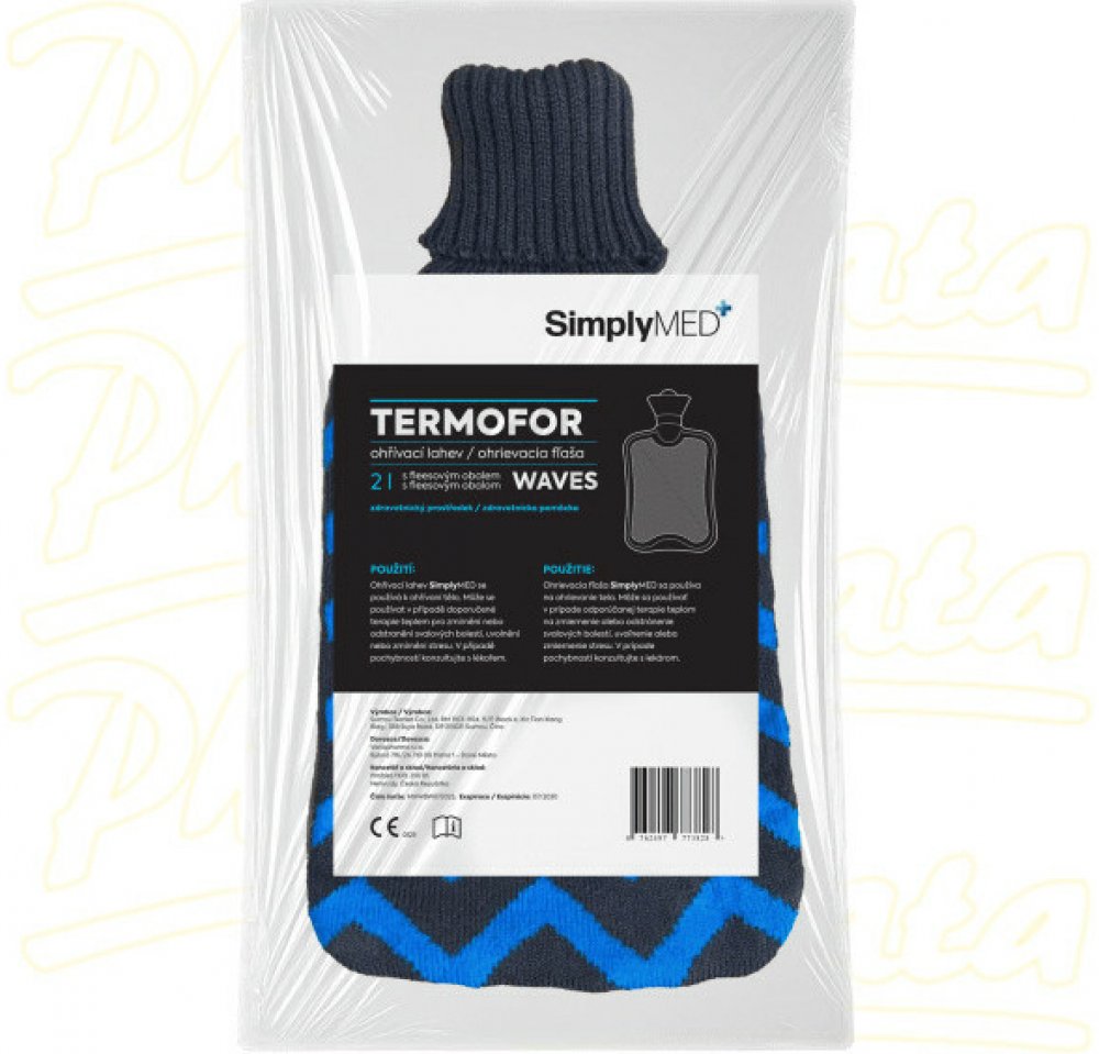 Termofor SimplyMed s měkkým, na dotyk příjemným obalem. Ohřívací lahev s objemem 2 litry je vyrobena ze silné, tepelně odolné pryže. Po naplnění vodou požadované teploty se uzavře šroubovacím uzávěrem. Drží pevně a dokonale těsní, takže se nemusíte bát nechtěného úniku vody. Měkký obal zpříjemňuje kontakt s lidskou pokožkou. Je snímatelný a pratelný v pračce. Termofor lze používat i bez obalu. Teplý termofor je ideální pro obyčejné prohřátí rukou a nohou v zimě, nebo třeba studených peřin na chalupě. Nahřátí pomáhá také při svalových křečích, zmírňuje bolesti, zlepšuje prokrvení, uklidňuje a uvolňuje. Termofor můžete využívat i pro studenou terapii, třeba pro redukci zánětu a snížení otoku. Větší plocha pokryje i rozsáhlejší postižené místo. Prázdnou ohřívací lahev lze díky malým rozměrům snadno přibalit do cestovního zavazadla.SloženíBavlna, gumová pryž