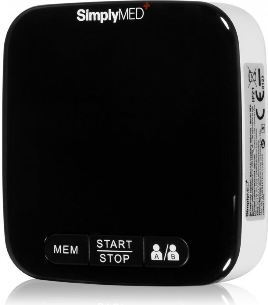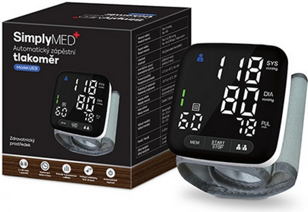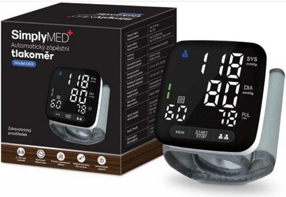 SimplyMed černá, šedá bateriové 180 měření na zápěstí pro cestování (na baterie) pro běžné sledování zdraví pro páry (2 profily) oscilometrické automatické 103 g 132 x 100 x 45 mm pro malé paže integrovaná bez hadičky