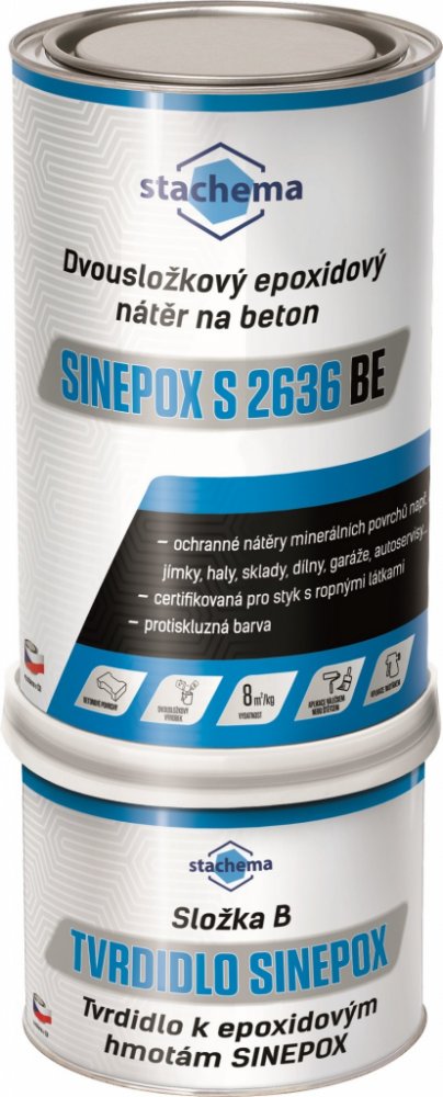 Dvousložkový epoxidový nátěr na beton Dvousložková epoxidová plnící nátěrová hmota pro ochranné nátěry na betonové povrchy a betonové nádrže na skladování ropy a ropných produktů. Ideální pro nátěry průmyslově namáhaných betonových podlah a silikátových podkladů v automyčkách, pro nátěry garáží, dílen atd. Protiskluzný. Systém 3 v 1 = penetrace, mezivrstva a vrchní nátěr. Vynikající chemická a mechanická odolnost, výborná přilnavost a otěruvzdornost, velmi dobrá kryvost nátěru. Certifikovaná pro styk s ropnými látkami. Odolnost kapalinám (ČSN EN ISO 2812-1): benzin Natural 95, benzin Natural 98, benzin Speciál, benzin Super, nafta, olej Mogul Super Barevný odstín: 0110 - šedý polomatný (cca RAL 7040) Tužení: nbsp; nbsp; poměr hmotnostní SINEPOX S 2636 BE : složka B = 100 : 20 Ředidlo: Ředidlo S 6300 Spotřeba: 8 – 9 m2 z 1 kg natužené směsi, tj. spotřeba 125 – 110 g/m2 (při suché tloušťce 40 μm). Při mokré tloušťce nátěrového filmu 80 μm se získá suchá tloušťka nátěrového filmu 40 μm. Praktická spotřeba je závislá na hrubosti, savosti podkladu a zvolené aplikační metodě. Při dodržení spotřeby nátěru minimálně 0,5 kg natužené směsi SINEPOX S 2636 BE/ m2 Certifikát pro styk s ropnými látkami Nepoužívat na: - mokré a nevyzrálé povrchy, nesoudržné povrchy, - povrchy opatřené vodouředitelným nátěrem nebo nitrobarvou, - strojově hlazené povrchy, kletované povrchy – nutná předúprava povrchu, viz výše. Přisoušet je možno nejdříve po odtěkání rozpouštědel (cca po 50 minutách od nanesení). Teplota přisoušení nesmí překročit +60 °C (doba přisoušení při této teplotě je 1 hodina). Nepoužívejte naftové ani propanbutanové hořáky