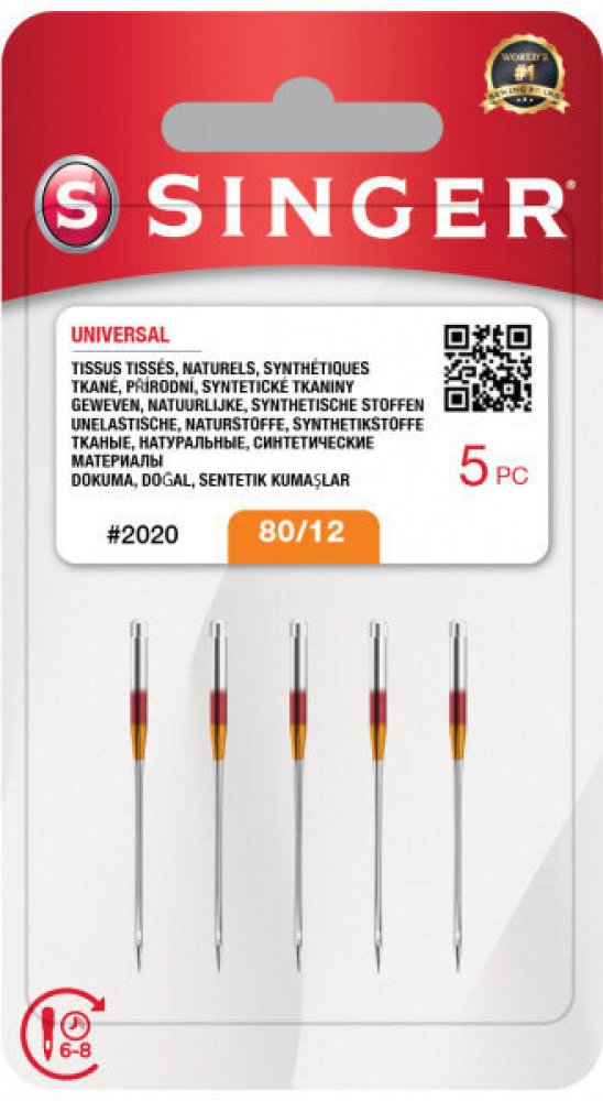 Jehly univerzální pro domácí šicí stroje Singer, síla 5 x 80/12Univerzální jehly jsou vhodné na všechny typy tkaniny - díky zaoblené špičce a zúženému konci snadno prokluzují jak běžným materiálem, tak úplety.Jehly Singer pro šicí stroje mají barevné označení typu jehly na dříku:Metallic (pro metalické nitě - bez barevného označení), Quilting (pro quiltování - fialové označení), Universal (universální na všechny tkaniny - červené označení), Overlock 14SH (pro overlocky - bez barevného označení), Microtex (pro mikrovlákno, hedvábí - černé označení), Jeans (pro džínovinu - modré označení), Leather (pro kůži a koženku - hnědé označení), Hemstitch (pro obrubování - bez barevného označení), Embroidery (pro vyšívací stroje - bílé označení), Stretch (pro pleteniny - žluté označení, Overlock 14U (pro overlocky - bez označení).Dále jsou jehly značeny barevně, podle síly jehly (velikosti jehly). Označení 100 odpovídá šíři jehly 1 mm. Označení jsou tato:60/08 (bez barevného označení), 70/09 (zelené označení), 80/12 (oranžové označení), 90/14 (modré označení), 100/16 (fialové označení), 110/18 (žluté označení), 130/21 (červené označení).Sílu jehly vybíráme s ohledem na typ materiálu. Nit musí jehlou vždy lehce projít, nesmí se zadrhávat.- Lehké a tenké materiály požadují jehly tenké, potom vybíráme tenké nitě- Silné materiály požadují jehly silnější, potom můžeme vybírat silnější nitěFirma Singer doporučuje měnit jehlu po 6 - 8 hodinách šití (šicích hodin), tato doba je doporučená a závisí i na typu tkaniny.