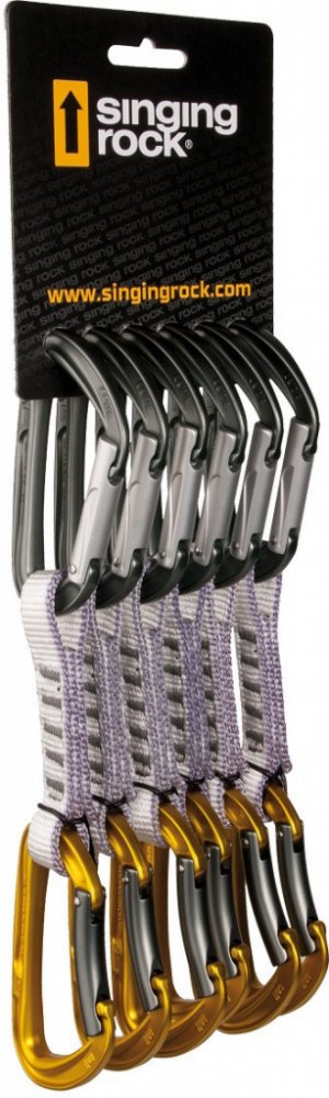Singing Rock Colt 16 6 Pack je set šesti expresek složených z karabiny s plným rovným zámkem, karabiny s plným prohnutým zámkem a 16 mm široké a 12 cm dlouhé smyčky z odolného polyamidu. Colt 16 6 Pack od výrobce Singing Rock je set šesti odolných expresek s plnými zámky, které jsou vhodné zejména pro sportovní lezení. Horní duralová karabina Keylock má plný rovný zámek, který má speciálně tvarované drážky pro snadné cvakání a vycvakávání karabiny z nýtu. Spodní duralová karabina s plným prohnutým zámkem umožňuje snazší cvakání a vycvakávání lana. Velké zaoblení zajišťuje snazší skluz a snižuje tak opotřebení lana i karabin samotných. Snadné cvakání i vycvakávání umožňuje specifický tvar kovaného nosu. Odlehčená konstrukce hot-forged I-beam zaručuje velkou pevnost (zatížení až 11 kN při otevřeném zámku) a nízkou hmotnost zároveň. Každá karabina je individuálně testovaná na zatížení 10 kN. Jejich korozní odolnost je vylepšena eloxováním povrchu. Karabiny propojuje 16 mm široká a 12 cm dlouhá smyčka z odolného polyamidu, při čemž dolní prohnutá karabina je vybavena gumovým kroužkem pro držení správné pozice a snadnější cvakání lana. Hlavní přednosti produktu: Karabiny horní karabina s rovným plným zámkem spodní karabina s prohnutým plným zámkem fixace spodní karabiny gumovým kroužkem pevnost v podélném směru. 26 kN pevnost v příčném směru: 8 kN pevnost s otevřeným zámkem: 11 kN světlost plného zámku: 21 mm Smyčka délka smyčky: 12 cm šířka smyčky: 16 mm odolný polyamid