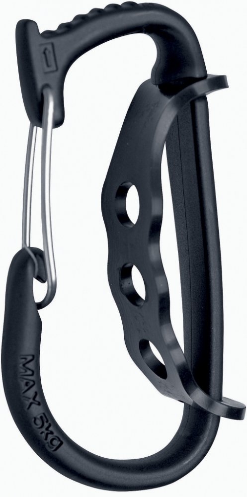 Velký pomocník při říci nebo při ledovcovém lezení. Plastová pomocná karabina je nosič materiálu nebo ledovcových šroubů.