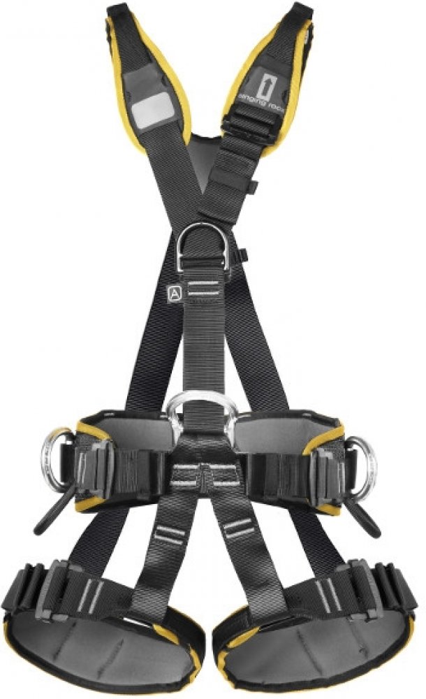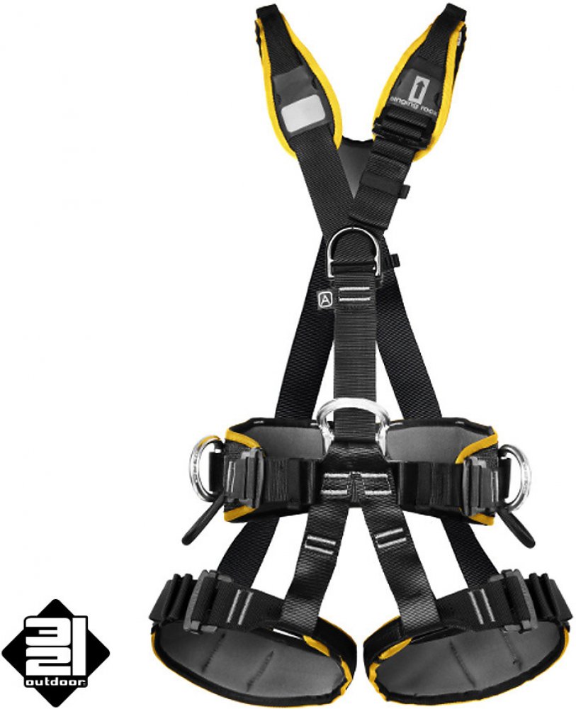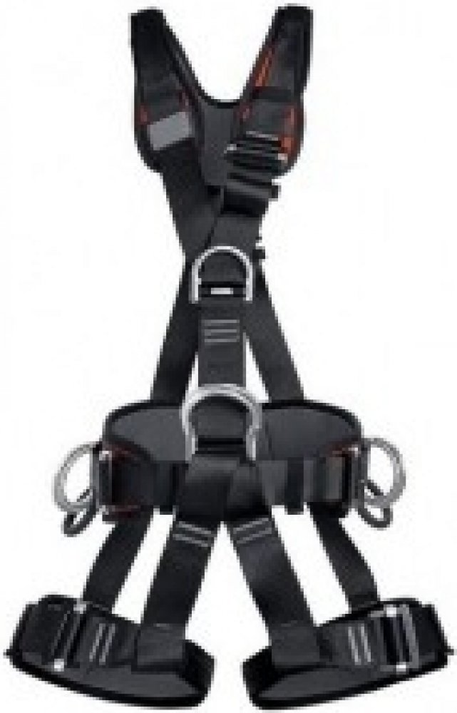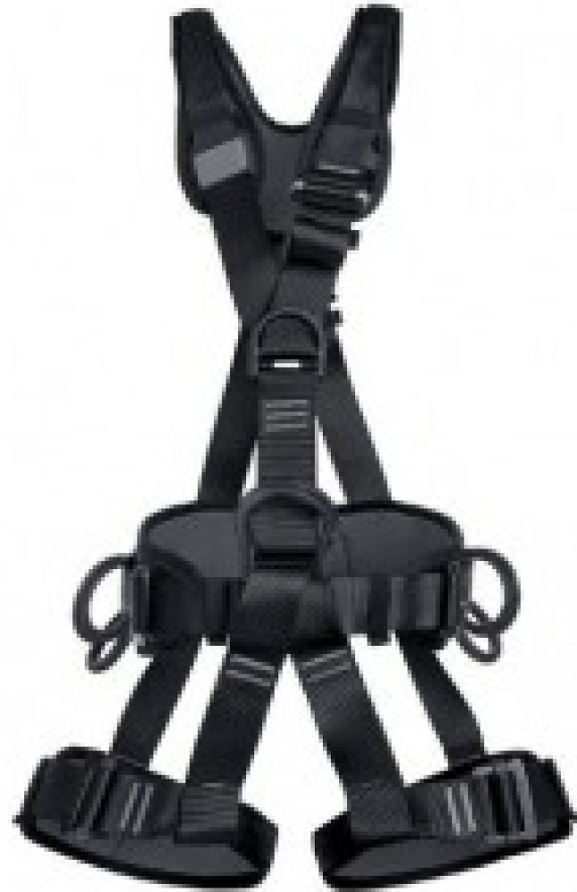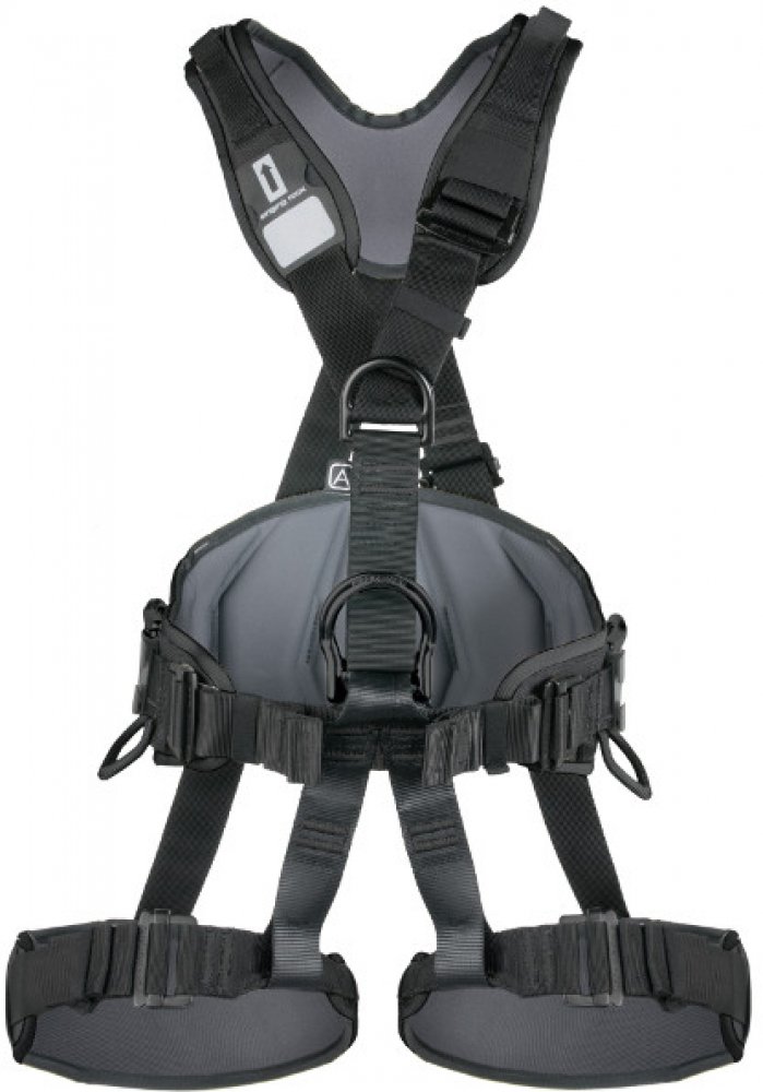 Plně nastavitelný úvazek pro zachycení pádu s polstrovaným bederním pásem, nohavičkami a ramenními popruhy.
