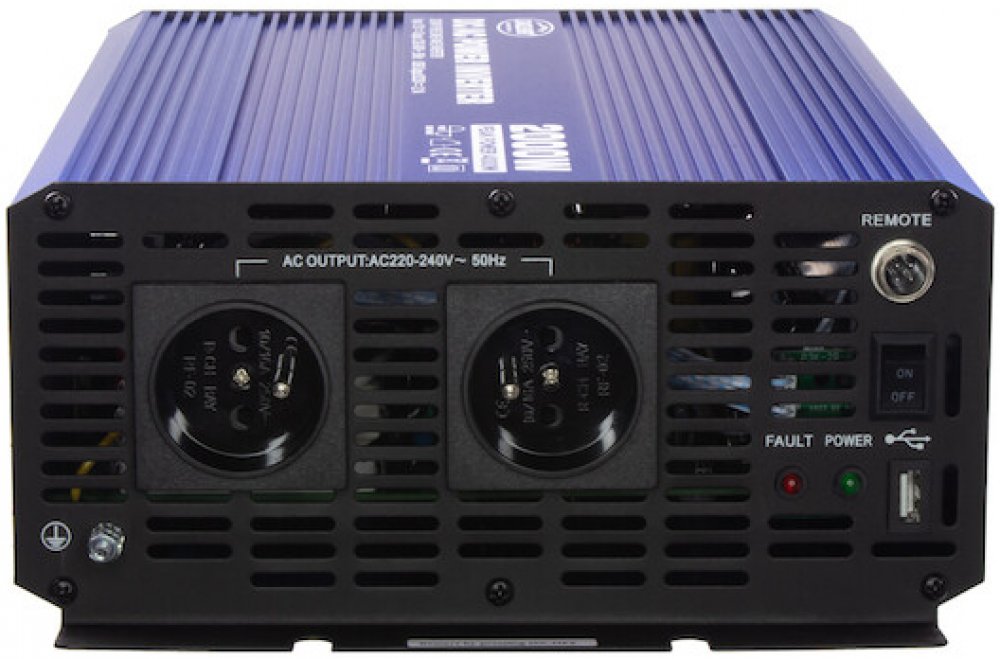 Sinusový měnič vhodný pro napájení všech druhů spotřebičů s odporovou zátěží i pro spotřebiče s indukční zátěží jako jsou motory, čerpadla, ledničky, zářivky atd. Dále je tento měnič vhodný pro spolehlivé a bezpečné napájení televizorů, DVD, počítačů, tiskáren, měřících přístrojů a jiných el. spotřebičů. Tento měnič je navíc vybaven informačním LED displejem a USB výstupem pro nabíjení USB zařízení (MP3 přehrávač apod.).Dále je tento měnič vybaven speciálním "Sleeping mode", kdy umožňuje automatické zapnutí při zátěži 5/10/15% (dle nastavení). Pro dálkové ovládání měniče je možné přikoupit kabelové dálkové ovládání 35psw04. Technické parametry- maximální špičkový výkon 4000 W (několik sekund)- maximální stálý výkon 2000 W- klidový příkon: 1,5A (úsporný režim cca 400 mA)- vstupní napětí 12 V- rozměry 345 x 230 x 108 mm- USB výstup 5 V (max. 2,1 A)- výstupní napětí 230 V- výstupní frekvence 50 ± 3 Hz- napájecí kabel s očky- ochrana proti přetížení, přehřátí, přepětí na vstupu, podpětí na vstupu, ochrana proti přepólování, možnost uzemnění. Nepropojujte do série nebo paralelně výstup střídavého napětí 230 V (kontakty síťové zásuvky) tohoto měniče s jinými zdroji střídavého napětí 230 V (například paralelně nebo sériově se síťovou zásuvkou veřejné rozvodné sítě/dalších měničů). UPOZORNĚNÍ: Váháte mezi použitím sinusového měniče nebo měniče s modifikovanou sinusoidou? Mezi obrázky naleznete tabulku s doporučeným výkonem měničů. Od 14.9.2015 již nebudeme brát při reklamaci zřetel na přetížený měnič.