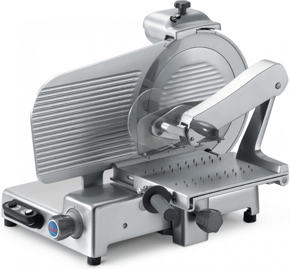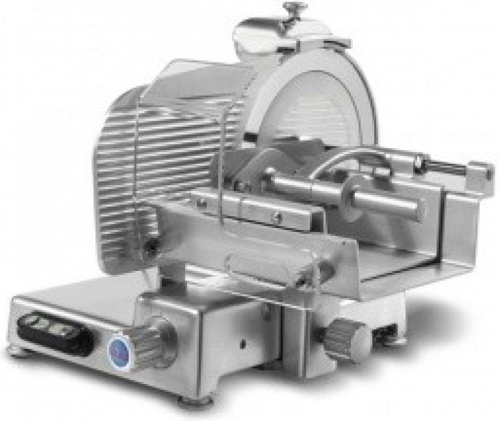 Nářezový stroj MANTEGNA 330 BS TOP s nožem o průměru 330 mm s uložením posuvného stolu rovně.