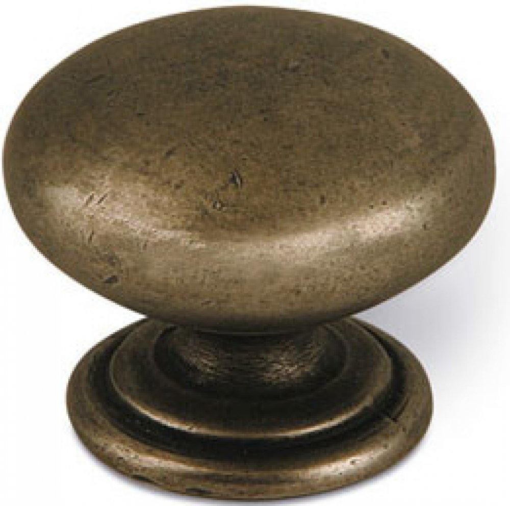 Rustikální knopka SIRO Alma staromosaz. Na obrázku je kulatá nábytková knopka SIRO ve starožitném stylu se staromosaznou povrchovou úpravou. Její tvar je jednoduchý a zaoblený, s hladkým povrchem a širokou horní částí, která přechází do menší základny. Knopka má robustní vzhled a díky své patinované úpravě působí jako historický kousek, který by se hodil k rustikálnímu nebo tradičnímu nábytku. Tento typ úchytky je často používán na zásuvkách nebo dvířkách skříněk, kde dodává nábytku klasický a elegantní vzhled