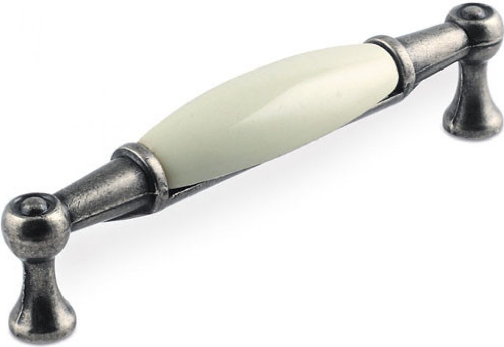 Rustikální úchytka AURORA - Délka: 107 mm, Rozteč: 96 mm, Povrch: starostříbro, je elegantní nábytková úchytka s kombinací kovu a keramického prvku. Kovové části úchytky mají antik povrchovou úpravu, což jim dodává starožitný vzhled. Střed úchytky tvoří keramický váleček s hladkým glazovaným efektem, který vytváří stylový kontrast s tmavším kovem. Konce úchytky jsou rozšířené a připomínají malé sloupky, které jí dodávají dekorativní a tradiční vzhled. Tento typ úchytky by se hodil na klasický nebo venkovský styl nábytku, jako jsou kuchyňské skříně nebo komody, kde by přinesla retro nebo vintage nádech.