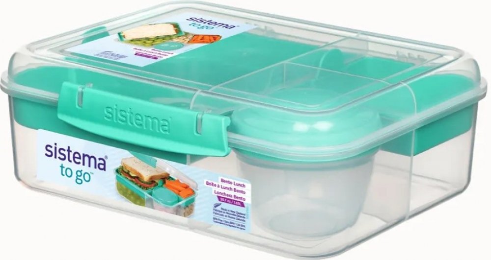 Box Bento Lunch To Go Sistema 1,6l transparentní/mátová je skvělá pomůcka, kterou si můžete vzít s sebou na cesty. Vhodný například na oběd a občerstvení na cestách. Je vybaven dvěmi vyjímatelnými přihrádkami a 150ml samostatným boxem na jogurt či dresing. Vnitřní přihrádky udržují jídlo čerstvé a oddělené. Díky snadno zaklapácím sponám a pružnému těsnění zůstane jídlo déle čerstvé. Stohovatelné a...