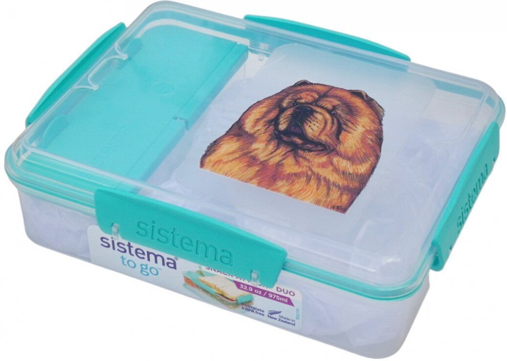 Novozélandská značka Sistema vyrábí svačinové boxy z nezávadného plastu, neobsahují ftaláty, ani BPA. Víčko se sundavá celé, k dóze jej spolehlivě přichytnou 4 plastové barevné klipy. Krabička je rozdělena na 3 části. Jedna větší část a 2 samostatné přihrádky s vlastními víčky v barvě klipu. Obrázek psích plemen je natištěn na velmi kvalitní čiré samolepce s matnou laminací. Box zatím nabízím v barvě klipu mint.