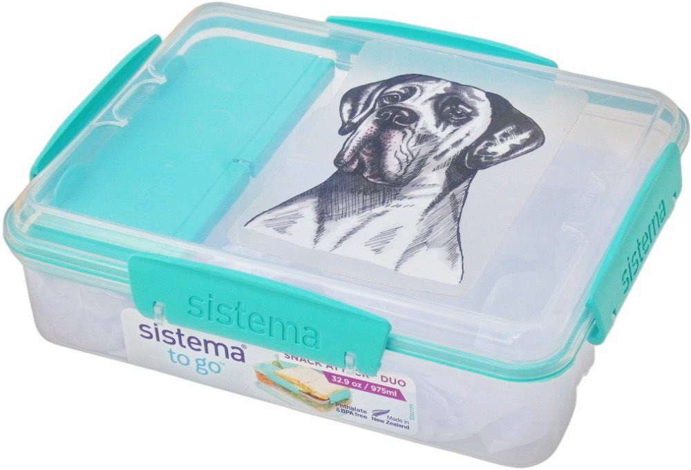Novozélandská značka Sistema vyrábí svačinové boxy z nezávadného plastu, neobsahují ftaláty, ani BPA. Víčko se sundavá celé, k dóze jej spolehlivě přichytnou 4 plastové barevné klipy. Krabička je rozdělena na 3 části. Jedna větší část a 2 samostatné přihrádky s vlastními víčky v barvě klipu. Obrázek psích plemen je natištěn na velmi kvalitní čiré samolepce s matnou laminací. Box zatím nabízím v barvě klipu mint.