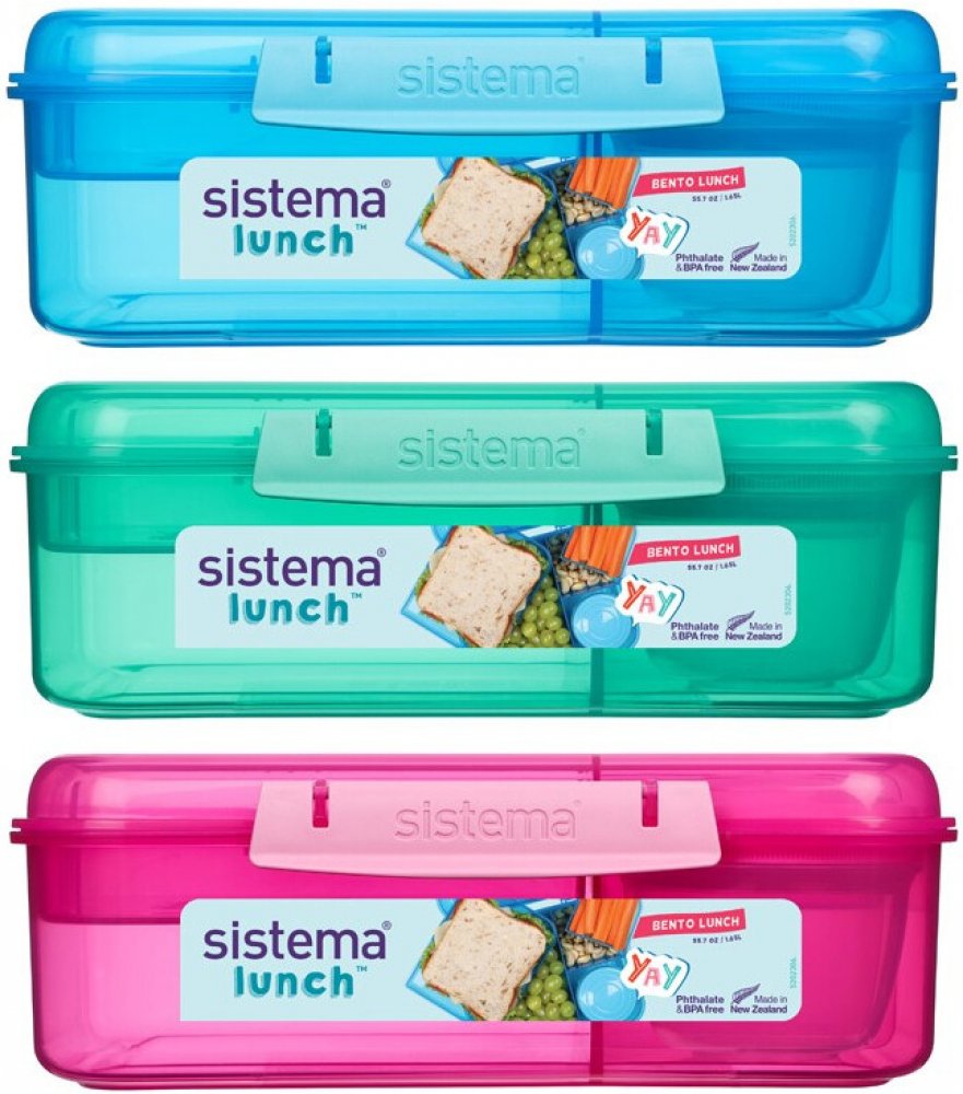 Vnitřní členění krabičky: spodní část krabičky je rozdělená dvěma pevnými přepážkami na 3 prostory, 2 vyjímatelné misky, kelímek s víčkem na omáčku nebo jogurt