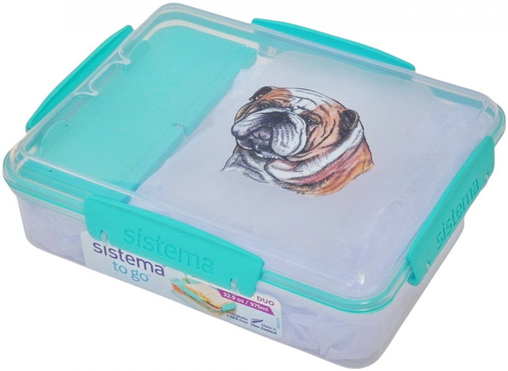 Novozélandská značka Sistema vyrábí svačinové boxy z nezávadného plastu, neobsahují ftaláty, ani BPA. Víčko se sundavá celé, k dóze jej spolehlivě přichytnou 4 plastové barevné klipy. Krabička je rozdělena na 3 části. Jedna větší část a 2 samostatné přihrádky s vlastními víčky v barvě klipu. Obrázek psích plemen je natištěn na velmi kvalitní čiré samolepce s matnou laminací. Box zatím nabízím v barvě klipu mint.
