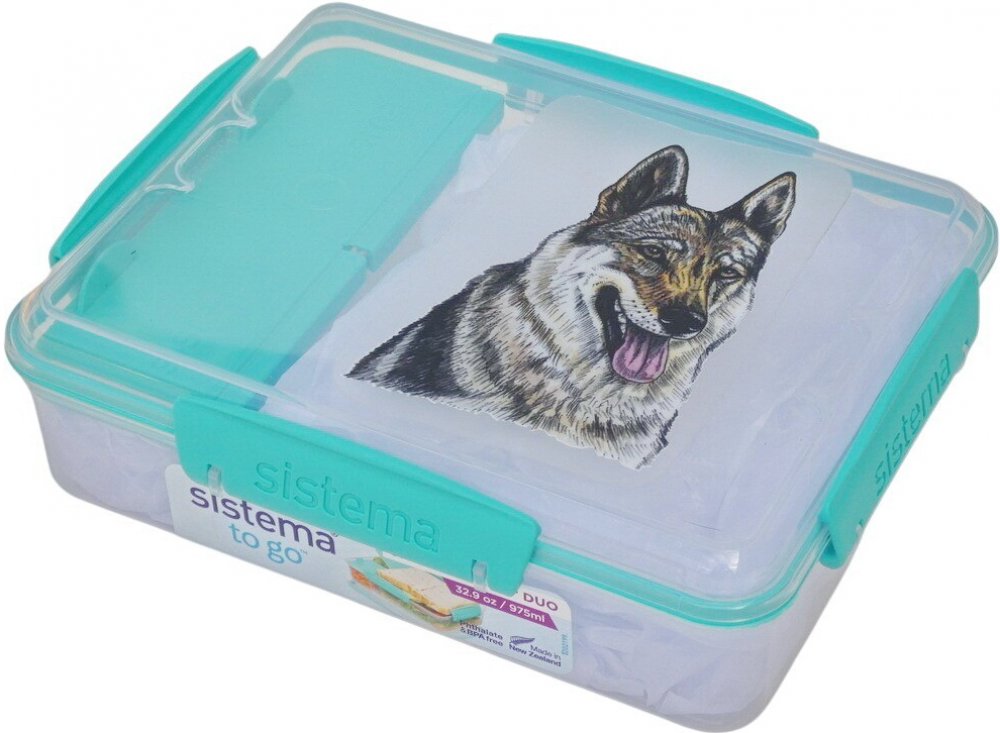 Novozélandská značka Sistema vyrábí svačinové boxy z nezávadného plastu, neobsahují ftaláty, ani BPA. Víčko se sundavá celé, k dóze jej spolehlivě přichytnou 4 plastové barevné klipy. Krabička je rozdělena na 3 části. Jedna větší část a 2 samostatné přihrádky s vlastními víčky v barvě klipu. Obrázek psích plemen je natištěn na velmi kvalitní čiré samolepce s matnou laminací. Box zatím nabízím v barvě klipu mint.