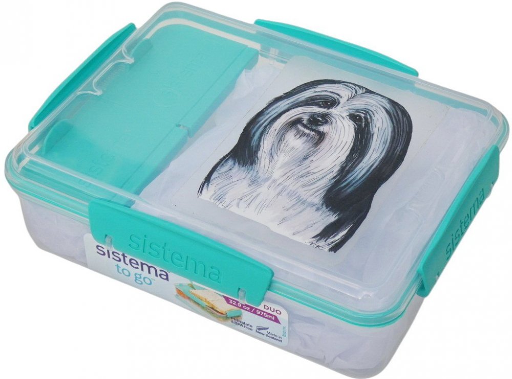 Novozélandská značka Sistema vyrábí svačinové boxy z nezávadného plastu, neobsahují ftaláty, ani BPA. Víčko se sundavá celé, k dóze jej spolehlivě přichytnou 4 plastové barevné klipy. Krabička je rozdělena na 3 části. Jedna větší část a 2 samostatné přihrádky s vlastními víčky v barvě klipu. Obrázek havaňáčka je natištěn na velmi kvalitní čiré samolepce s matnou laminací. Box zatím nabízím v barvě klipu mint.