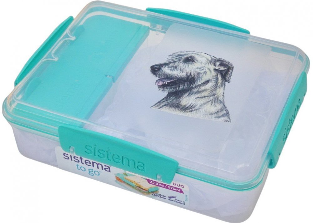 Novozélandská značka Sistema vyrábí svačinové boxy z nezávadného plastu, neobsahují ftaláty, ani BPA. Víčko se sundavá celé, k dóze jej spolehlivě přichytnou 4 plastové barevné klipy. Krabička je rozdělena na 3 části. Jedna větší část a 2 samostatné přihrádky s vlastními víčky v barvě klipu. Obrázek psích plemen je natištěn na velmi kvalitní čiré samolepce s matnou laminací. Box zatím nabízím v barvě klipu mint.