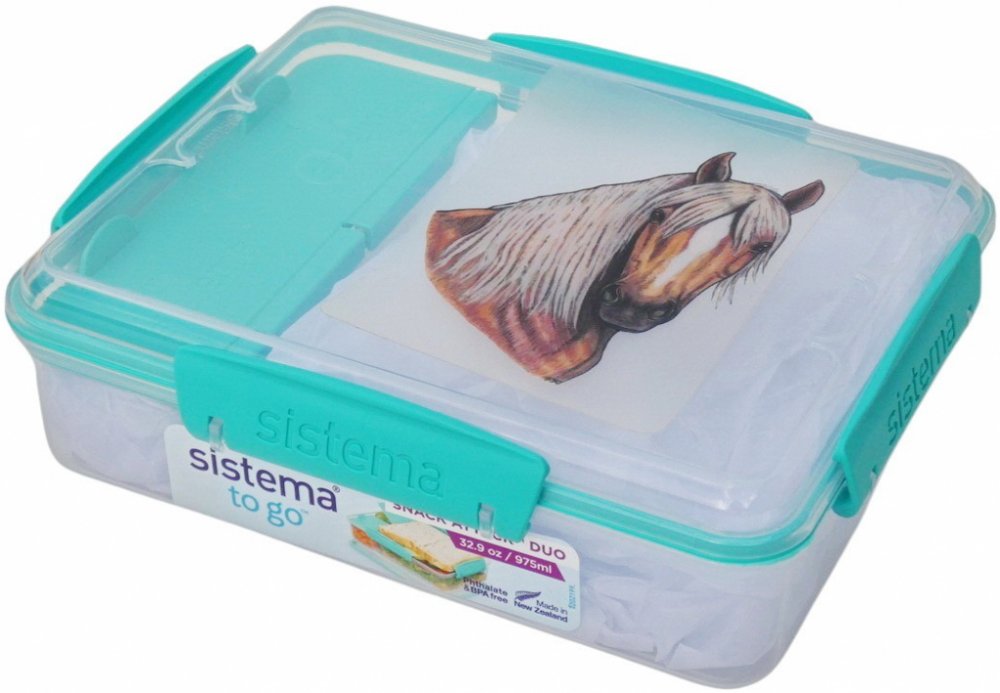 Novozélandská značka Sistema vyrábí svačinové boxy z nezávadného plastu, neobsahují ftaláty, ani BPA. Víčko se sundavá celé, k dóze jej spolehlivě přichytnou 4 plastové barevné klipy. Krabička je rozdělena na 3 části. Jedna větší část a 2 samostatné přihrádky s vlastními víčky v barvě klipu. Obrázek koně je natištěn na velmi kvalitní čiré samolepce s matnou laminací. Box zatím nabízím v barvě klipu mint.