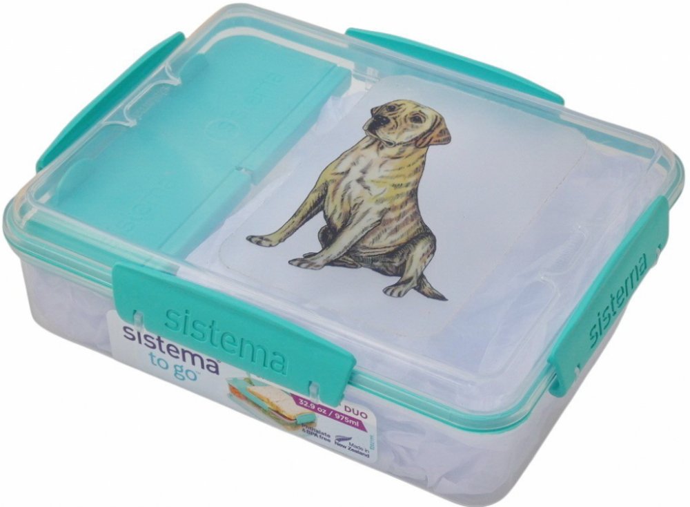 Novozélandská značka Sistema vyrábí svačinové boxy z nezávadného plastu, neobsahují ftaláty, ani BPA. Víčko se sundavá celé, k dóze jej spolehlivě přichytnou 4 plastové barevné klipy. Krabička je rozdělena na 3 části. Jedna větší část a 2 samostatné přihrádky s vlastními víčky v barvě klipu. Obrázek psích plemen je natištěn na velmi kvalitní čiré samolepce s matnou laminací. Box zatím nabízím v barvě klipu mint.