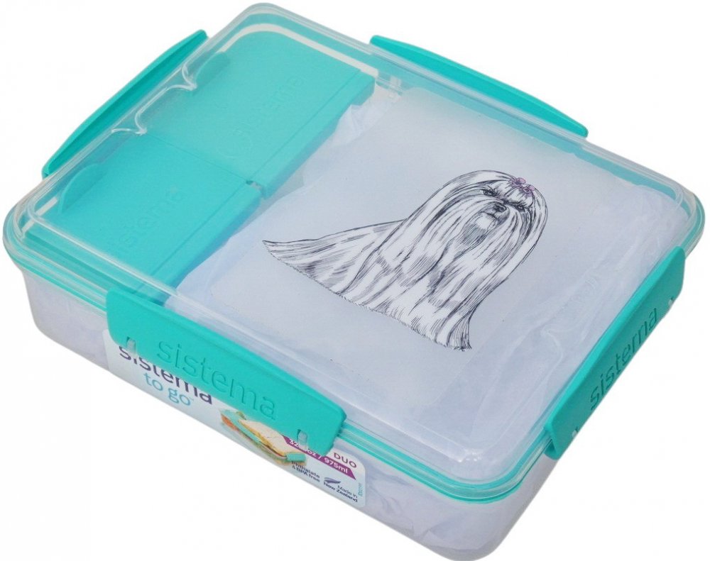 Novozélandská značka Sistema vyrábí svačinové boxy z nezávadného plastu, neobsahují ftaláty, ani BPA. Víčko se sundavá celé, k dóze jej spolehlivě přichytnou 4 plastové barevné klipy. Krabička je rozdělena na 3 části. Jedna větší část a 2 samostatné přihrádky s vlastními víčky v barvě klipu. Maltézáček je natištěn na velmi kvalitní čiré samolepce s matnou laminací. Box zatím nabízím v barvě klipu mint.
