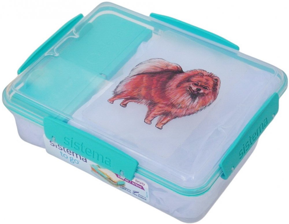 Novozélandská značka Sistema vyrábí svačinové boxy z nezávadného plastu, neobsahují ftaláty, ani BPA. Víčko se sundavá celé, k dóze jej spolehlivě přichytnou 4 plastové barevné klipy. Krabička je rozdělena na 3 části. Jedna větší část a 2 samostatné přihrádky s vlastními víčky v barvě klipu. Obrázek psích plemen je natištěn na velmi kvalitní čiré samolepce s matnou laminací. Box zatím nabízím v barvě klipu mint.