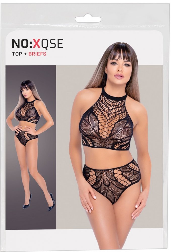 Horní díl a spodní díl bez rozkroku od NO:XQSE s různými síťovanými strukturami. Top s elastickým páskem za krk, elastická ramínka na zádech. Kalhotky s vysokým střihem a vyzývavým otvorem v rozkroku. Všechny jsou bezešvé a velmi elastické pro mimořádně příjemné nošení.