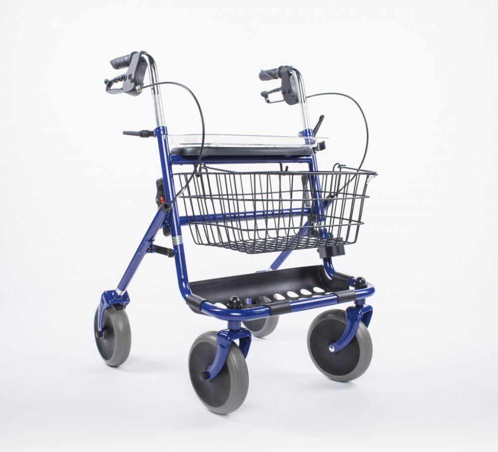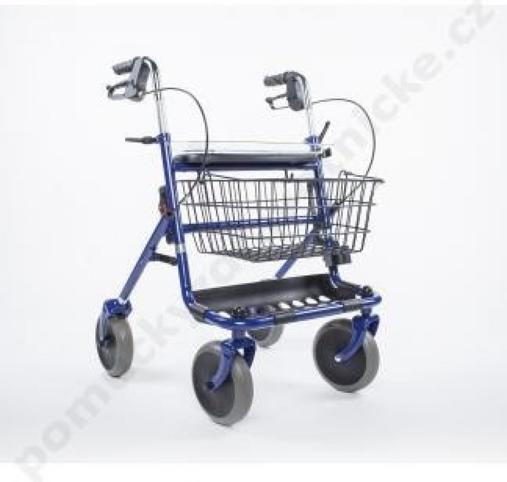 Velice stabilní skládací čtyřkolové chodítko se sedákem a nákupním košíkem.