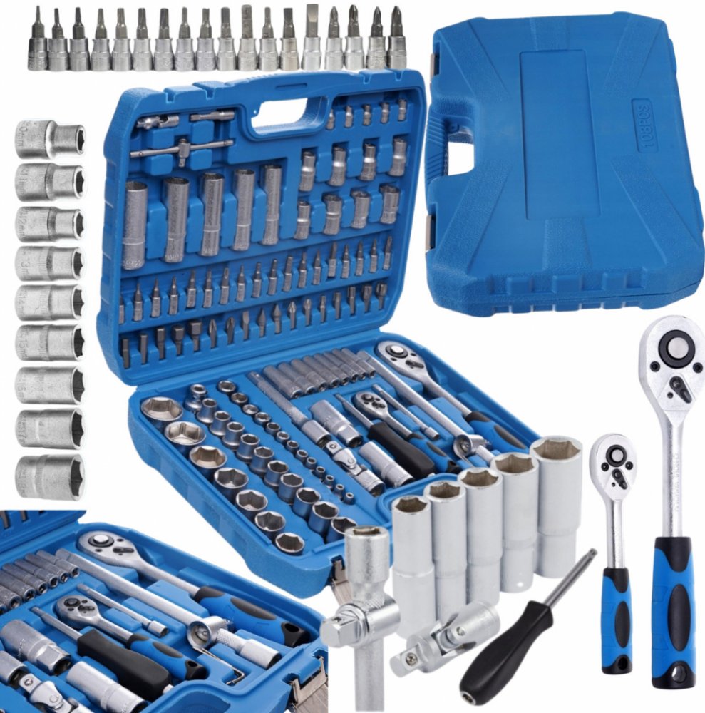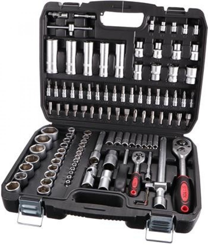 Praktická gola sada TOOL SET PLUS 108 se 108 díly hlavic a bitů s ráčnami v odolném plastovém kufru. Tato gola sada si najde místo v každé domácí dílně nebo garáži. Obsahuje celou škálu nástrčných hlavic, zástrčných klíčů, bitů, dvě ráčny, univerzální šroubovací rukojeť a další. Nářadí je vyrobeno z pochromované uhlíkové oceli a uloženo v odolném plastovém kufru s kovovými přezkami.