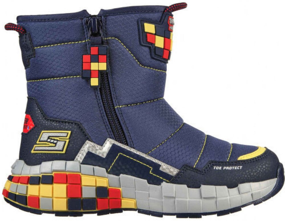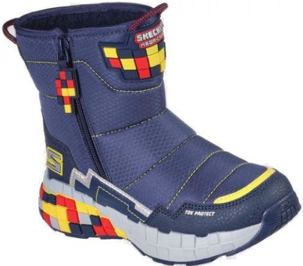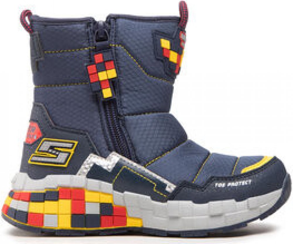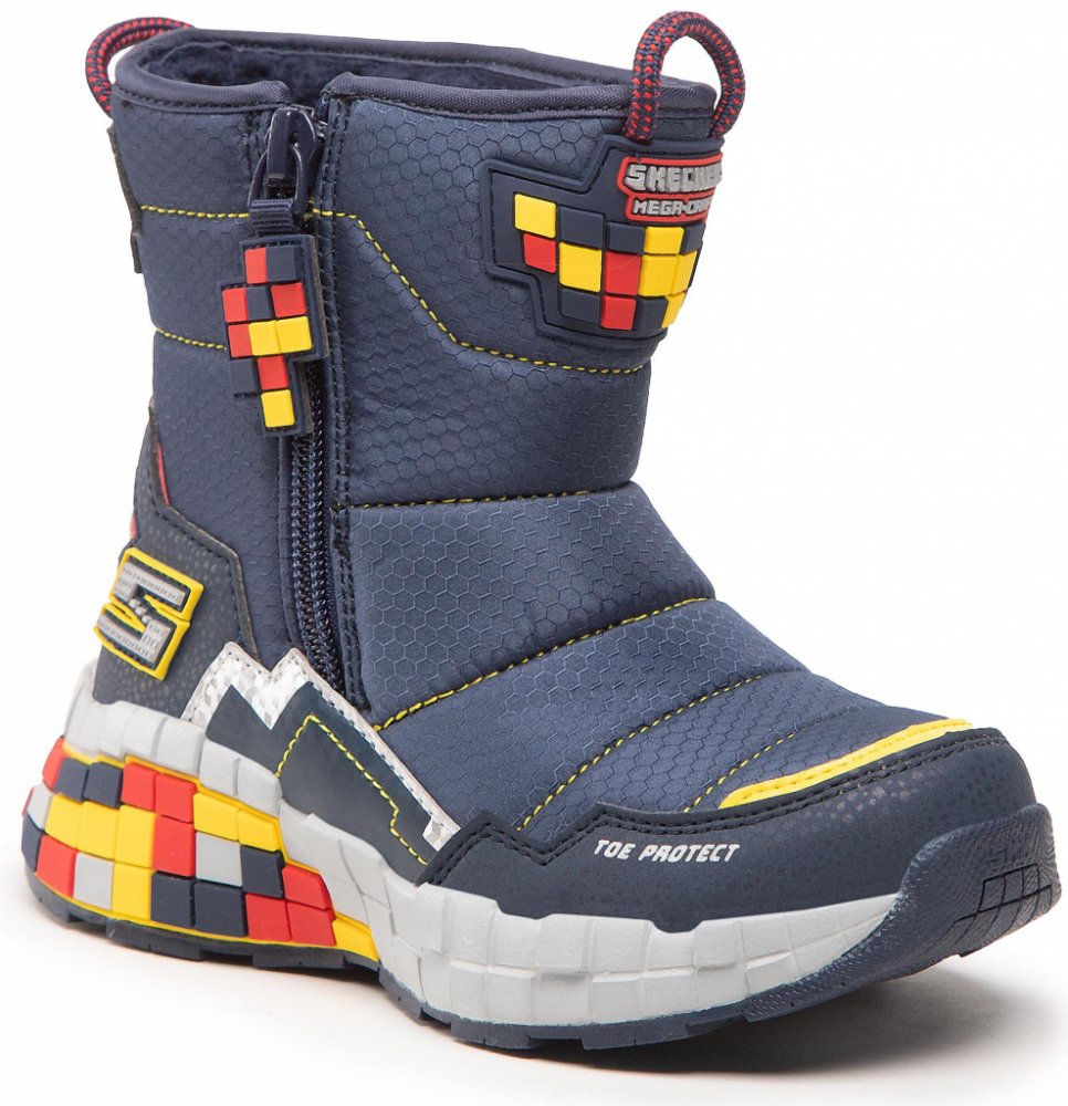 Výška podpatku: Plochý (do 3 cm). Typ podrážky: Pryžová, syntetická. Typ vnitřního materiálu: Materiál: syntetika. Barva: Tmavě modrá. Tvar: Boty. Typ uživatele: Děti. Roční období: Zima. Svrchní materiál: Syntetika. Typ zapínání: Zip. Určení: Univerzální. Značka: Skechers, Pohlaví: Pro chlapce, Typ výrobku: Sněhule, Barva: Tmavě modrá, Materiál: Syntetika Zapínání: Zip