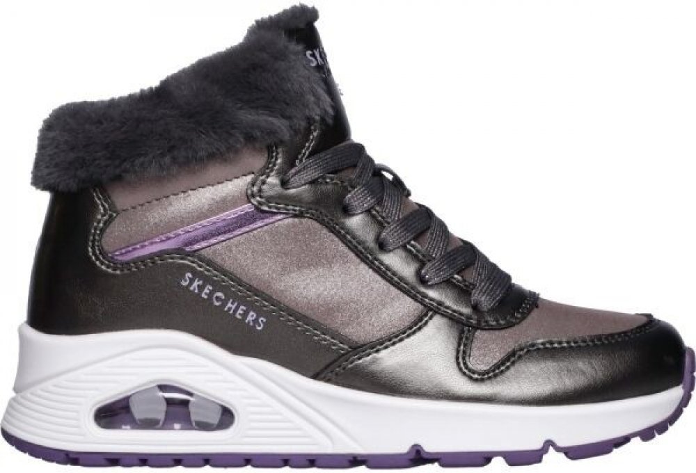 Zůstaňte v teple a leskněte se stylově s dívčí zimní obuví Skechers UNO - COZY ON AIR. Toto módní šněrování má kovový syntetický svršek s lemem z umělé kožešiny, stélku Skechers Air-Cooled Memory Foam® a viditelnou mezipodešev Skech-Air® se vzduchovým odpružením na platformě.