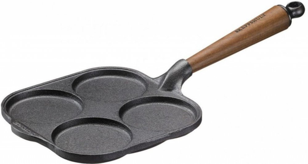 Pánev SKEPPSHULT o vnějším průměru 20,5 cm, průměr otvorů 9,5 cm a čistá hloubka otvorů 0,9 cm. Vnější průměr dosedací plochy spodku dna je 19,2 cm. Držadlo z kvalitního dřeva (ořech). Celková délka cca 45 cm a váha 2,1 kg. Použití pro tyto tepelné zdroje: Tento špičkový produkt je originál švédský výrobek té nejvyšší kvality. Solidnost a tradice(od r. 1906). Bez chemických přísad, bez umělého pov...