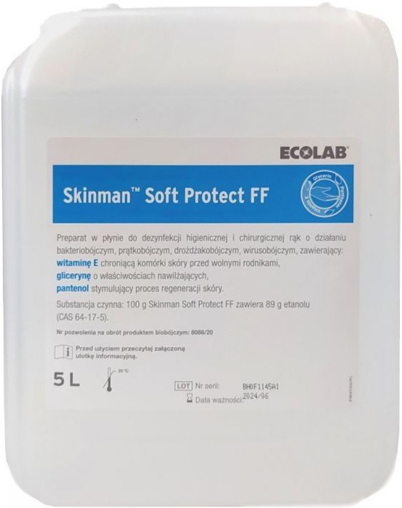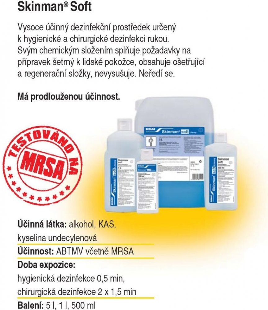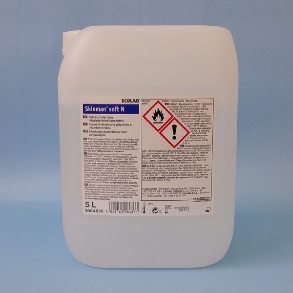 Vysoce účinná a pro pokožku maximálně bezpečná alkoholová dezinfekce, která představuje ideální spojení dezinfekce rukou a péče o ně.Přípravek neobsahuje barviva, zabraňuje vysoušení a je proto vhodný i pro velmi citlivou pokožku. Proto je přípravek Skinman®Soft N vyhledáván pracovníky oborů s vysokými nároky na hygienu a vysokou frekvencí dezinfekce rukou. Pouze pro profesionální použití.