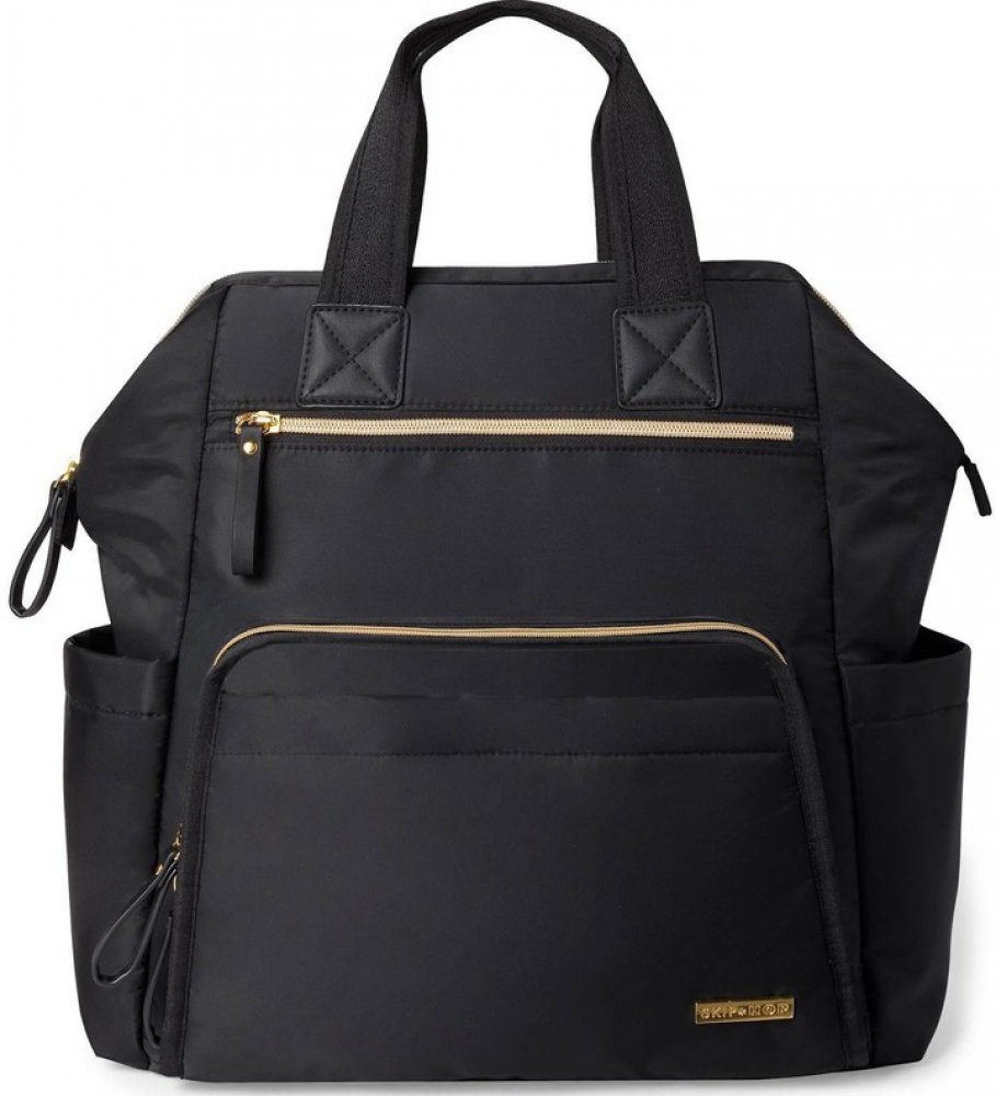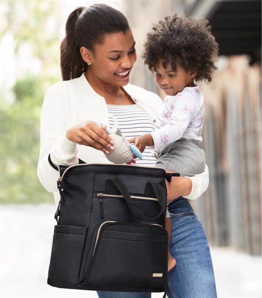 Taška nabízí velkou hlavní přihrádku se zabezpečením na zip a množství kapes pro věci jako je telefon, láhev na vodu a klíče. Díky nastavitelným popruhům lze tašku použít jako batoh, a to maminkám umožní mít volné ruce, což je k nezaplacení.
