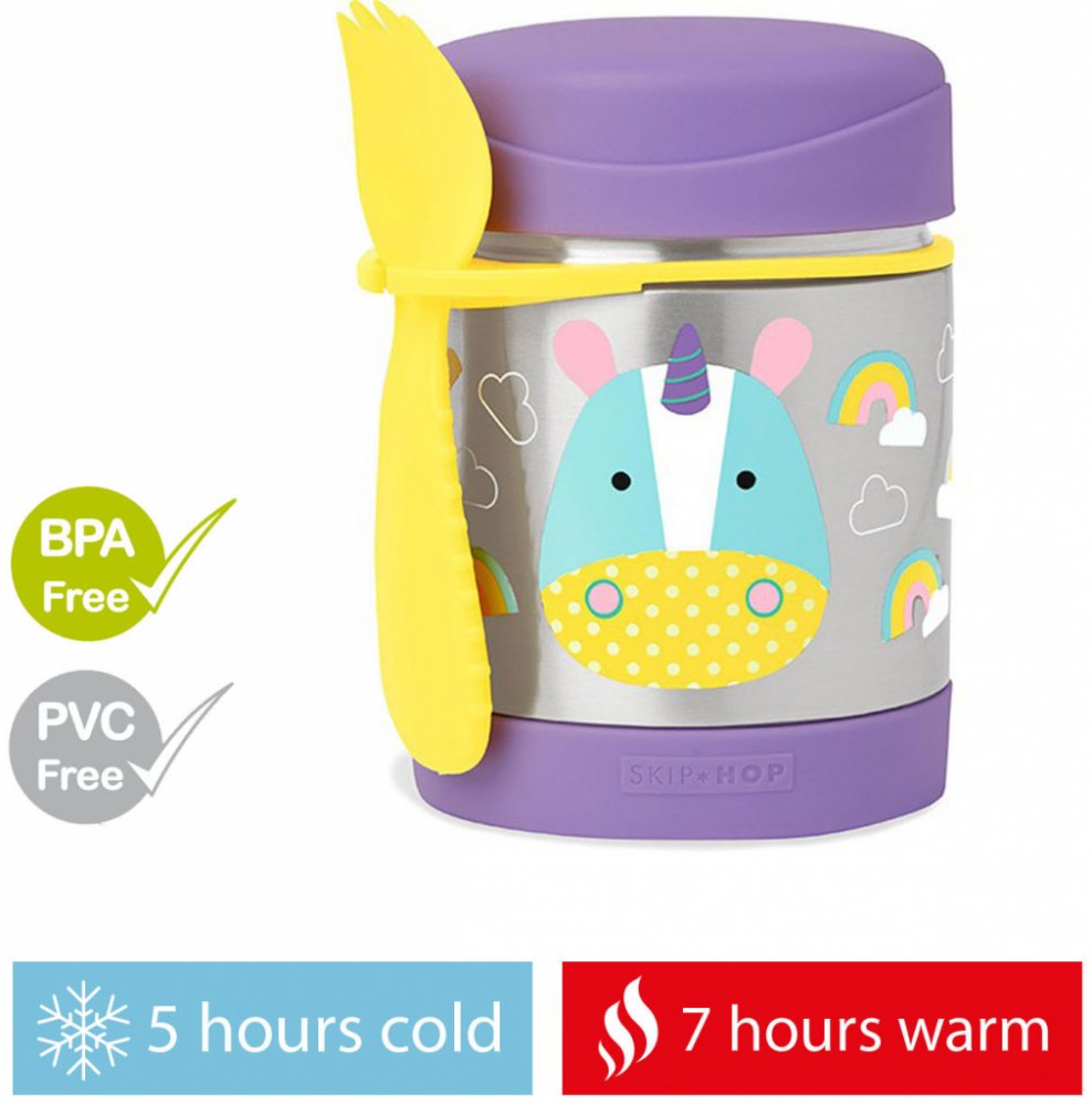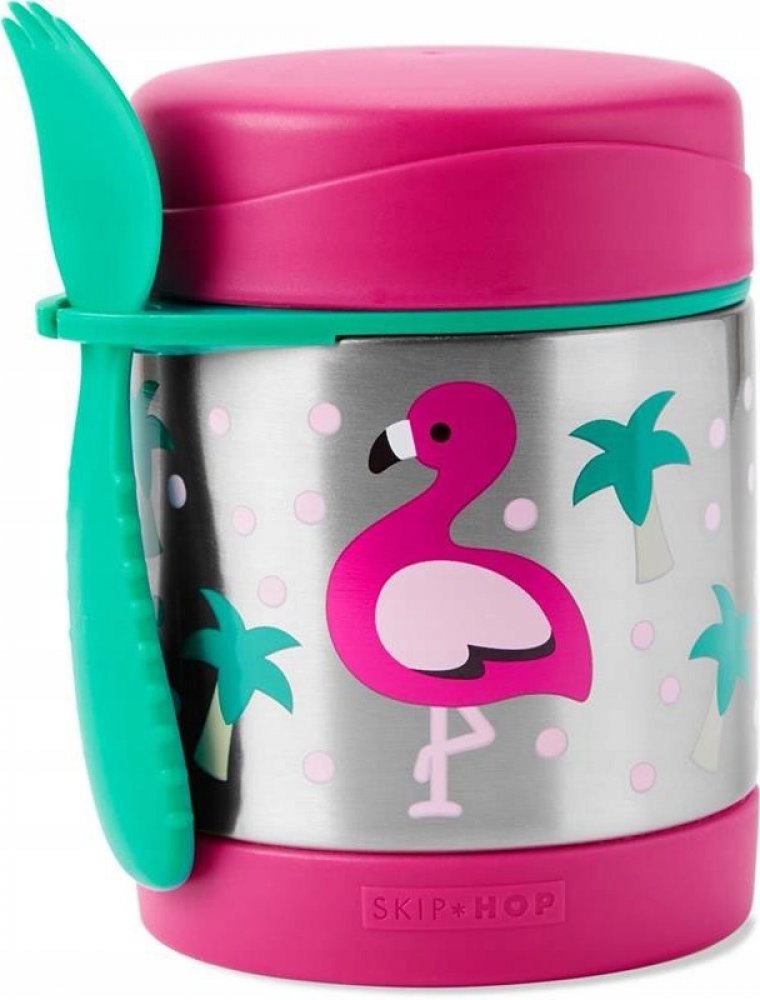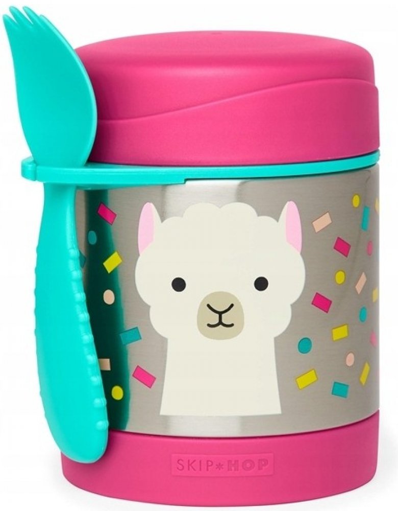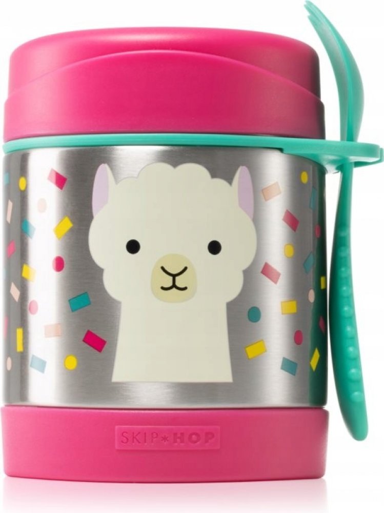 SKIP HOP Tato krásná termoska z nerezové oceli s potiskem udrží dětskou porci teplou či studenou. Součástí je praktická vidlička (lžička+vidlička v jednom), kterou lze zavěsit do držátka. Držátko je možné využít i k uložení jiného dětského příboru (obdobného rozměru). Termoska uchová připravený pokrm: teplý až po dobu 7 hodin a studený až po dobu 5 hodin v závislosti na teplotě připravovaného pokrmu a na venkovní teplotě. Pro lepší výsledek, připravovaný pokrm předehřejte/ochlaďte v teplé/studené vodě po dobu 5ti minut před vložením do termosky.