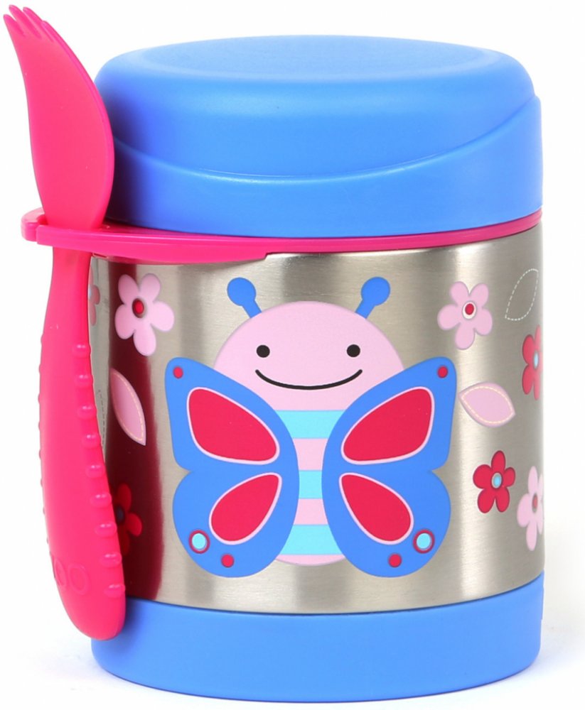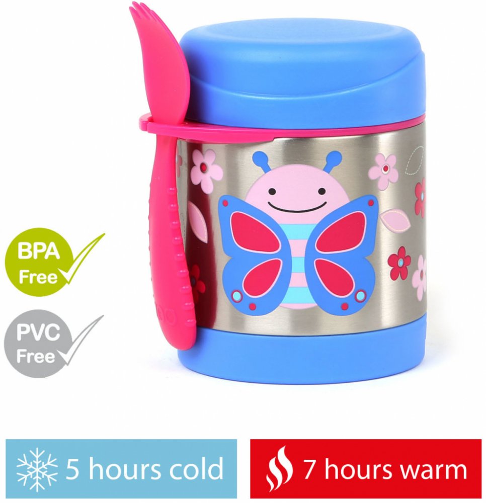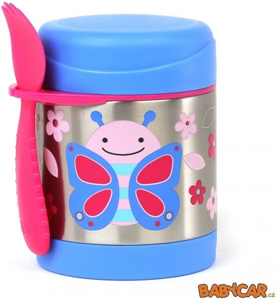 SKIP HOP Tato krásná termoska z nerezové oceli s potiskem udrží dětskou porci teplou či studenou. Součástí je praktická vidlička (lžička plus vidlička v jednom), kterou lze zavěsit do držátka. Držátko je možné využít i k uložení jiného dětského příboru (obdobného rozměru). Termoska uchová připravený pokrm: teplý až po dobu 7 hodin a studený až po dobu 5 hodin v závislosti na teplotě připravovaného pokrmu a na venkovní teplotě. Pro lepší výsledek, připravovaný pokrm předehřejte/ochlaďte v teplé/studené vodě po dobu 5ti minut před vložením do termosky.