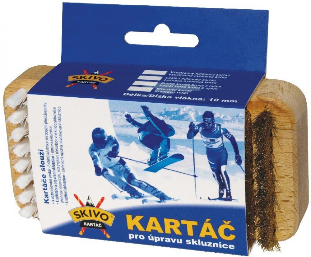 Kombinovaný kartáč je všestranný kartáč, který je určen k odstraňování vosků ze struktury skluznic lyží a snowboardů. Kombinovaný kartáč je všestranný kartáč, který je určen k odstraňování vosků ze struktury skluznic lyží a snowboardů, k čištění skluznice po použití škrabky, k očištění a otevření skluznice před navoskováním, pro zvýšení absorpce vosku do skluznice, k leštění skluznice.Kartáčujte vždy jedním směrem, od špičky k patě lyže. Dodržujte také kartáčování v jednom směru vláken kartáče (na kartáči je k tomuto zobrazena směrová šipka). Síla, kterou tlačíte na kartáč je závislá na druhu použití. Pokud odstraňujete vosk ze skluznice, vyviňte na kartáč větší přítlak, pokud skluznici leštíte, tlačte na kartáč již méně.