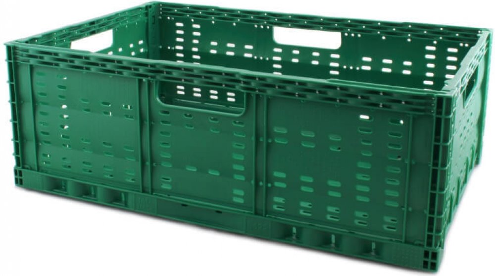 Skládací přepravka na ovoce a zeleninu či drobné zboží. Předností těchto přepravek je úspora místa při jejich složení. Zároveň jsou ale stabilní jak při stohování plných, tak i složených přepravek. Vhodné jako distribuční přepravky při rozvozech zboží. Zelená přepravka je vyrobena z PE materiálu a má rozměry 600*400*220 mm. Nosnost 20 kg, objem 44 l.