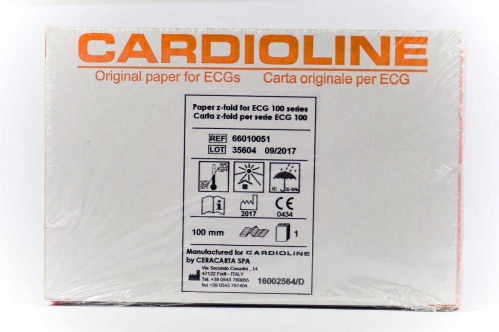 Skládaný termopapír 100 mm x 150 mm x 180 listů pro přímopíšící EKG Cardioline ECG100S nebo ECG100+.Chováme se ekologicky a pro přístroje Cardioline jsme zajistili lokálního výrobce EKG papírů, který odpovídá přísným standardnům kvality Cardioline.